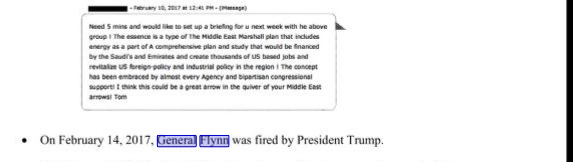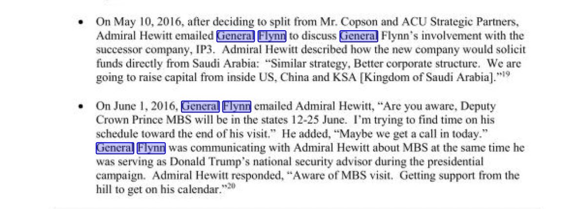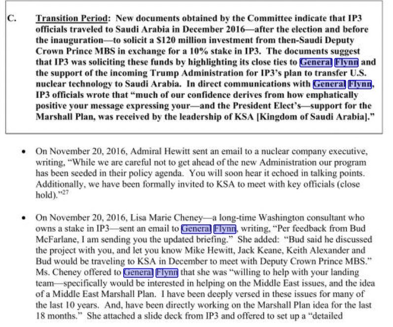 “On May 10, 2016, after deciding to split from Mr. Copson and ACU Strategic Partners, Admiral Hewitt emailed General Flynn to discuss General Flynn’s involvement with the successor company, IP3. Admiral Hewitt described how the new company would solicit funds directly from Saudi Arabia: “Similar strategy, Better corporate structure. We are going to raise capital from inside US, China and KSA [Kingdom of Saudi Arabia].” On June 1, 2016, General Flynn emailed Admiral Hewitt, “Are you aware, Deputy Crown Prince MBS will be in the states 12-25 June. I’m trying to find time on his schedule toward the end of his visit.” He added, “Maybe we get a call in today.” General Flynn was communicating with Admiral Hewitt about MBS at the same time he was serving as Donald Trump’s national security advisor during the presidential campaign. Admiral Hewitt responded, “Aware of MBS visit. Getting support from the hill to get on his calendar.”” “Transition Period : New documents obtained by the Committee indicate that IP3 officials traveled to Saudi Arabia in December 2016—after the election and before the inauguration—to solicit a $120 million investment from then-Saudi Deputy Crown Prince MBS in exchange for a 10% stake in IP3. The documents suggest that IP3 was soliciting these funds by highlighting its close ties to General Flynn and the support of the incoming Trump Administration for IP3’s plan to transfer U.S, nuclear technology to Saudi Arabia. In direct communications with General Flynn, IP3 officials wrote that “much of our confidence derives from how emphatically positive your message expressing your—and the President Elect’s—support for the Marshall Plan, was received by the leadership of KSA [Kingdom of Saudi Arabia].” On November 20, 2016, Lisa Marie Cheney—a long-time Washington consultant who owns a stake in IP3—sent an email to General Flynn, writing, “Per feedback from Bud McFarlane, I am sending you the updated briefing.” She added: “Bud said he discussed the project with you, and let you know Mike Hewitt, Jack Keane, Keith Alexander and Bud would be traveling to KSA in December to meet with Deputy Crown Prince MBS.” Ms. Cheney offered to General Flynn that she was “willing to help with your landing team—specifically would be interested in helping on the Middle East issues, and the idea of a Middle East Marshall Plan. I have been deeply versed in these issues for many of the last 10 years. And, have been directly working on the Marshall Plan idea for the last 18 months.” She attached a slide deck from IP3 and offered to set up a “detailed briefing” for General Flynn with IP3 officials Admiral Hewitt, Mr. McFarlane, General Keane, and General Alexander.”