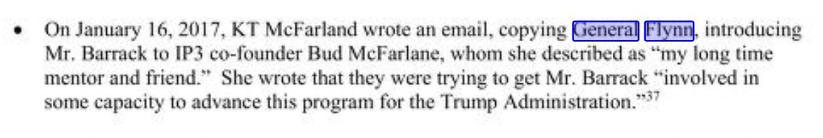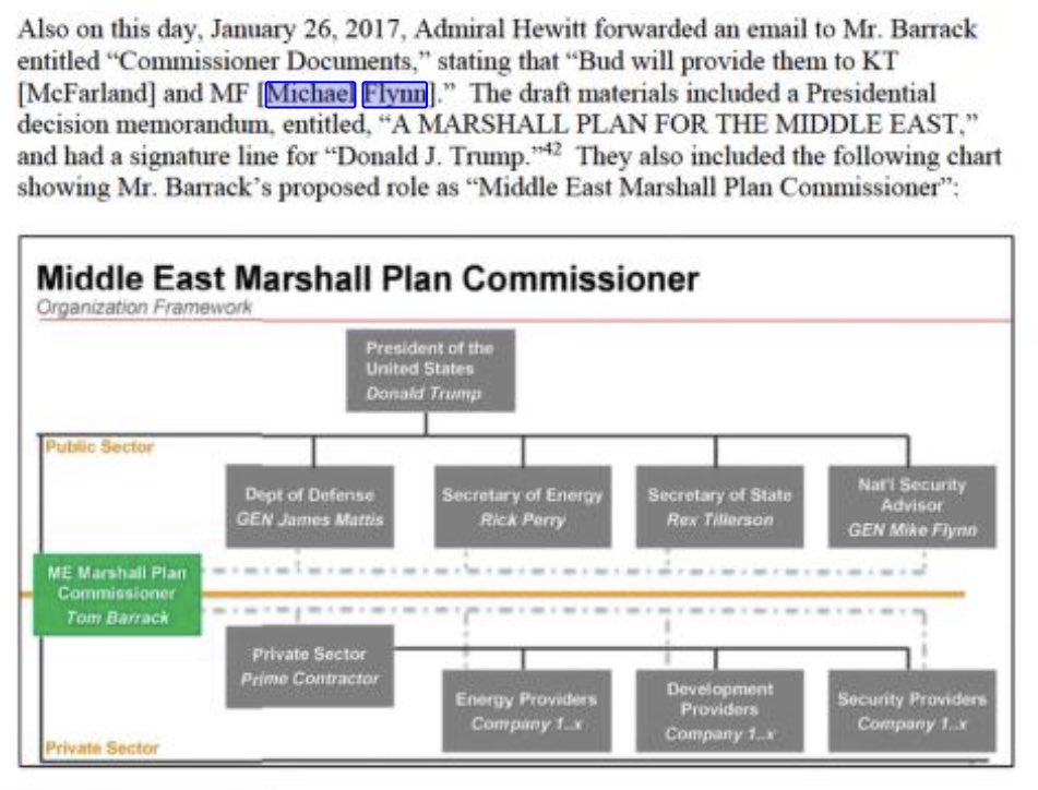 “On January 2, 2017, Mr. McFarlane sent an email to General Flynn, writing: “As may be evident Mike, we are terribly excited and enthusiastic toward this historic opportunity. I should note in particular that much of our confidence derives from how emphatically positive your message expressing your—and the President Elect’s—support for the Marshall Plan, was received by the leadership of KSA. It had a palpable impact on the tone and substance of all of our meetings.” General Flynn responded later that day, writing, “Bud, let me and [incoming Deputy National Security Advisor] KT [McFarland] figure out a time to get together to discuss all below. This sounds very exciting and we need to take advantage of the momentum that comes with this initiative.” On January 3, 2017, Mr. McFarlane sent an email to General Flynn, writing, “All of us here at IP3/IronBridge deeply appreciate your support and are committed to assuring that you’re never disappointed.” On January 16, 2017, KT McFarland wrote an email, copying General Flynn, introducing Mr. Barrack to IP3 co-founder Bud McFarlane, whom she described as “my long time mentor and friend.” She wrote that they were trying to get Mr. Barrack “involved in some capacity to advance this program for the Trump Administration.” Also on this day, January 26, 2017, Admiral Hewitt forwarded an email to Mr. Barrack entitled “Commissioner Documents,” stating that “Bud will provide them to KT [McFarland] and MF [Michael Flynn].” The draft materials included a Presidential decision memorandum, entitled, “A MARSHALL PLAN FOR THE MIDDLE EAST,” and had a signature line for “Donald J. Trump.” 42 They also included the following chart showing Mr. Barrack’s proposed role as “Middle East Marshall Plan Commissioner”