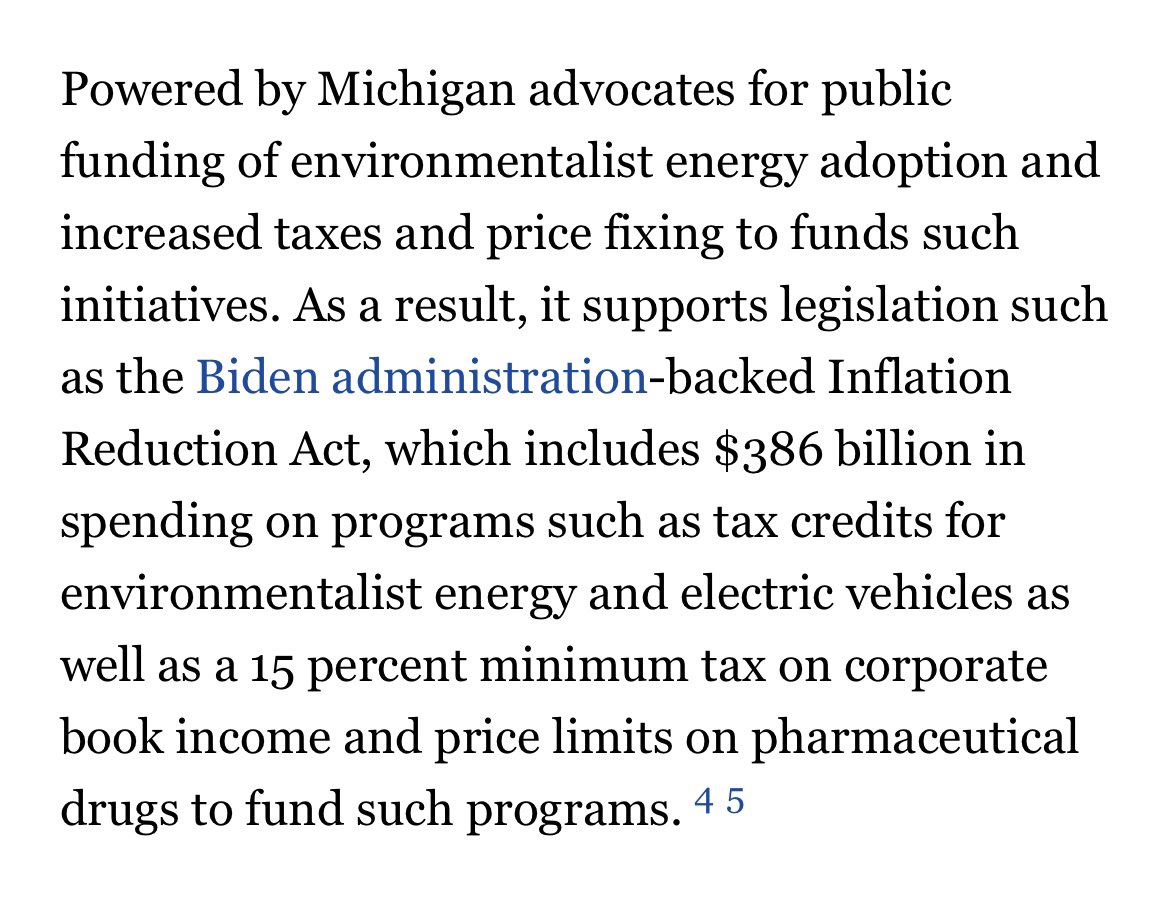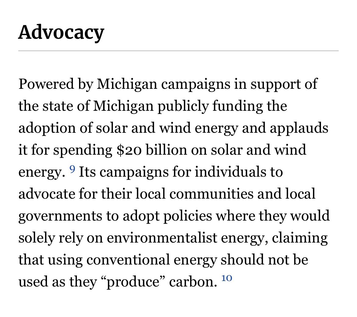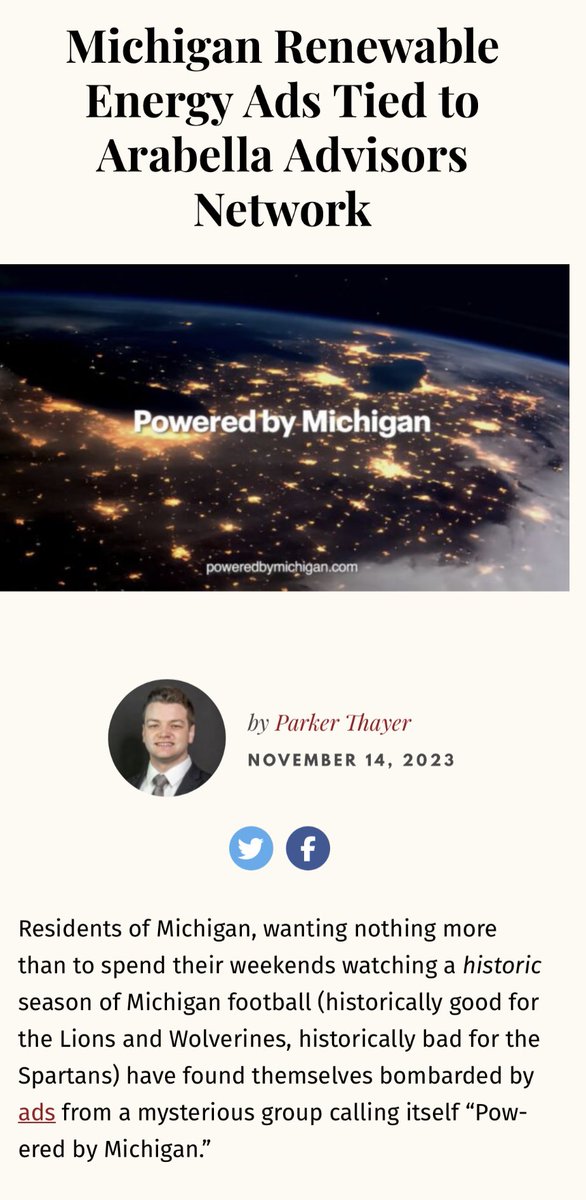Thread 🧵: How Arabella Advisors is influencing Michigan voters ahead of 2024. Here’s another Capital Research article i found regarding @arabellaadvisor and Michigan from this past November. Michigan Renewable Energy Ads Tied to Arabella Advisors Network “Residents of Michigan, wanting nothing more than to spend their weekends watching a historic season of Michigan football (historically good for the Lions and Wolverines, historically bad for the Spartans) have found themselves bombarded by ads from a mysterious group calling itself “Powered by Michigan.”” Who is Powered by Michigan? “Powered by Michigan is a project of Michigan League of Conservation Voters (Michigan LCV). In September 2023, it began an advertising campaign advocating that Michigan residents “demand” an immediate transition to reliance on environmentalist energy. Powered by Michigan advocates for public funding of environmentalist energy adoption and increased taxes and price fixing to funds such initiatives. As a result, it supports legislation such as the Biden administration-backed Inflation Reduction Act, which includes $386 billion in spending on programs such as tax credits for environmentalist energy and electric vehicles as well as a 15 percent minimum tax on corporate book income and price limits on pharmaceutical drugs to fund such programs.”