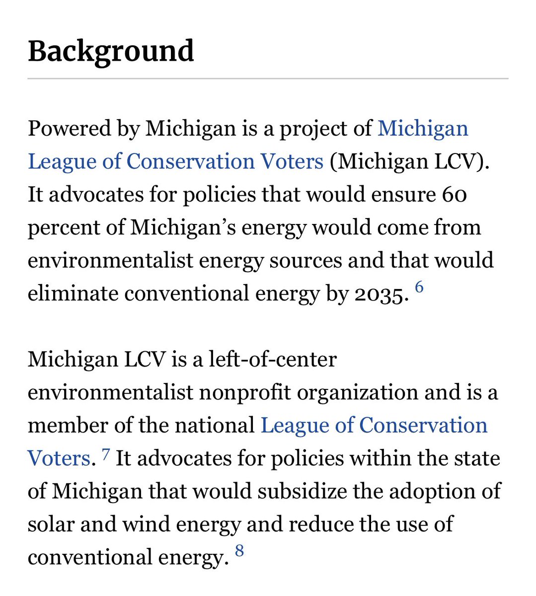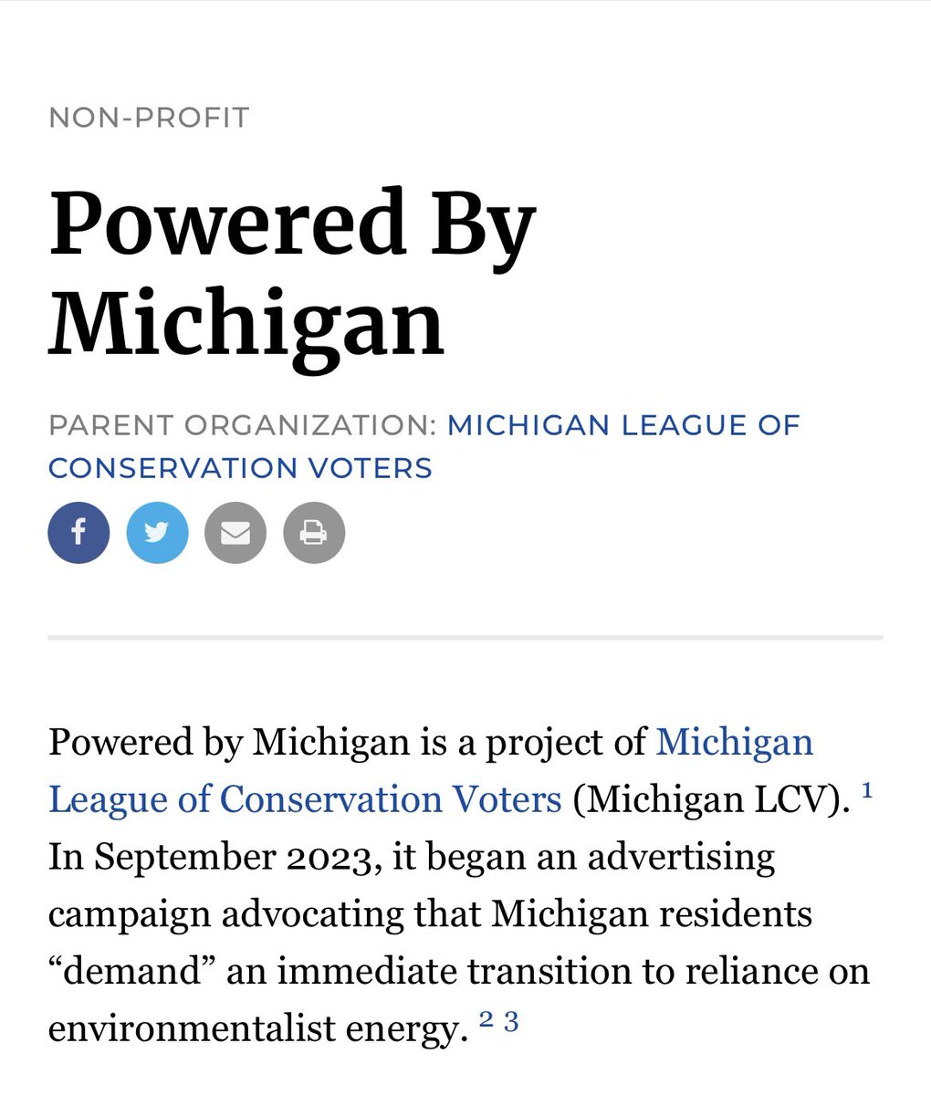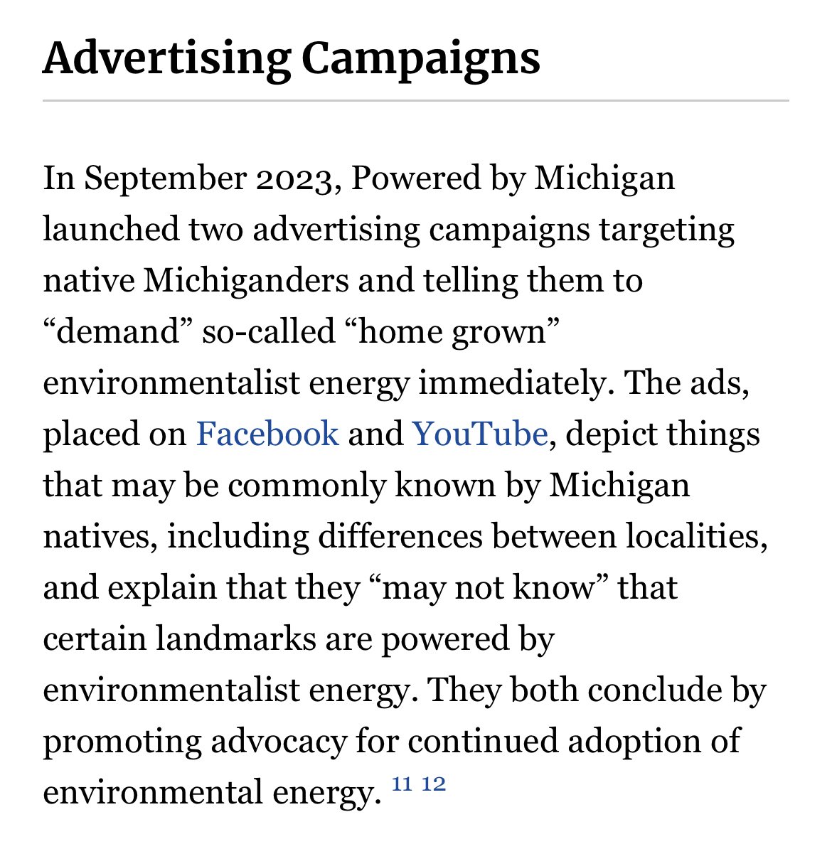 Background: “Powered by Michigan is a project of Michigan League of Conservation Voters (Michigan LCV). It advocates for policies that would ensure 60 percent of Michigan’s energy would come from environmentalist energy sources and that would eliminate conventional energy by 2035. Michigan LCV is a left-of-center environmentalist nonprofit organization and is a member of the national League of Conservation Voters. 7 It advocates for policies within the state of Michigan that would subsidize the adoption of solar and wind energy and reduce the use of conventional energy.” Advocacy: “Powered by Michigan campaigns in support of the state of Michigan publicly funding the adoption of solar and wind energy and applauds it for spending $20 billion on solar and wind energy. 9 Its campaigns for individuals to advocate for their local communities and local governments to adopt policies where they would solely rely on environmentalist energy, claiming that using conventional energy should not be used as they “produce” carbon.” Advertising Campaigns. “In September 2023, Powered by Michigan launched two advertising campaigns targeting native Michiganders and telling them to “demand” so-called “home grown” environmentalist energy immediately. The ads, placed on Facebook and YouTube, depict things that may be commonly known by Michigan natives, including differences between localities, and explain that they “may not know” that certain landmarks are powered by environmentalist energy. They both conclude by promoting advocacy for continued adoption of environmental energy.”