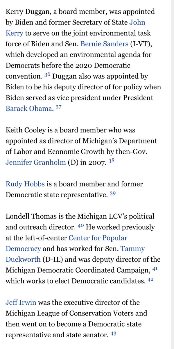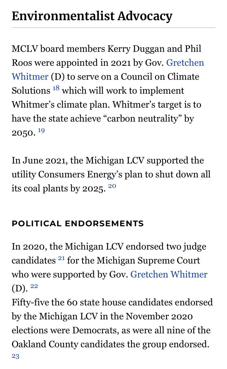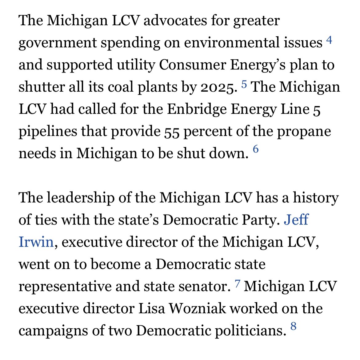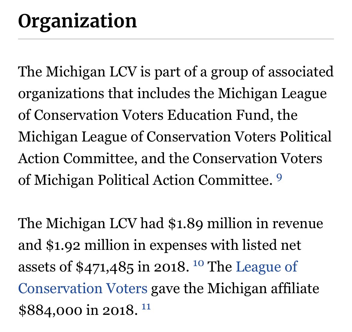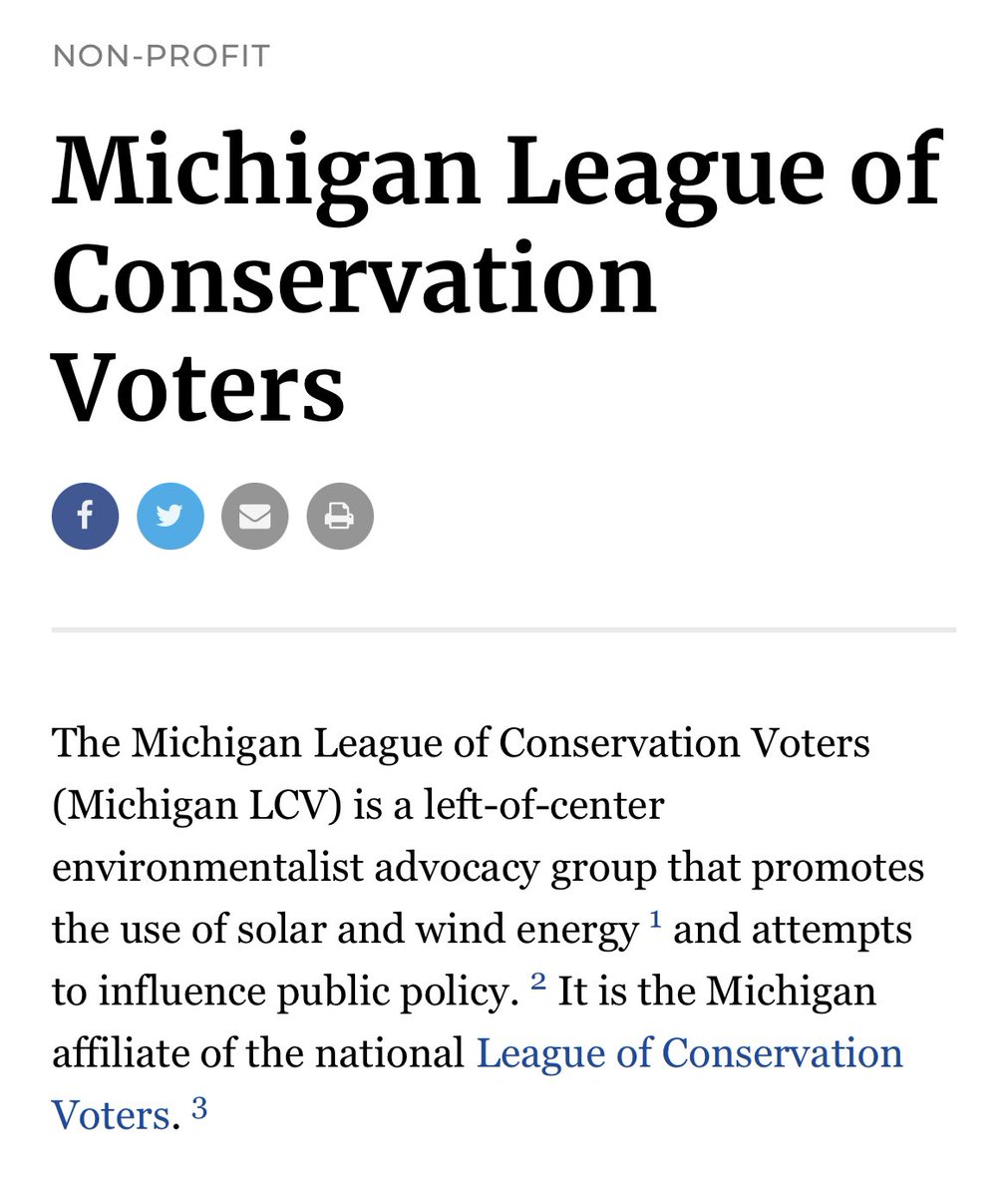 Now let’s take a look into the parent company of Powered by Michigan; Michigan League of Conservation Voters “The Michigan League of Conservation Voters (Michigan LCV) is a left-of-center environmentalist advocacy group that promotes the use of solar and wind energy and attempts to influence public policy. It is the Michigan affiliate of the national League of Conservation Voters. The Michigan LCV advocates for greater government spending on environmental issues and supported utility Consumer Energy’s plan to shutter all its coal plants by 2025. The Michigan LCV had called for the Enbridge Energy Line 5 pipelines that provide 55 percent of the propane needs in Michigan to be shut down. The leadership of the Michigan LCV has a history of ties with the state’s Democratic Party. Jeff Irwin, executive director of the Michigan LCV, went on to become a Democratic state representative and state senator. Michigan LCV executive director Lisa Wozniak worked on the campaigns of two Democratic politicians.” Organization: “The Michigan LCV is part of a group of associated organizations that includes the Michigan League of Conservation Voters Education Fund, the Michigan League of Conservation Voters Political Action Committee, and the Conservation Voters of Michigan Political Action Committee. The Michigan LCV had $1.89 million in revenue and $1.92 million in expenses with listed net assets of $471,485 in 2018. The League of Conservation Voters gave the Michigan affiliate $884,000 in 2018.”