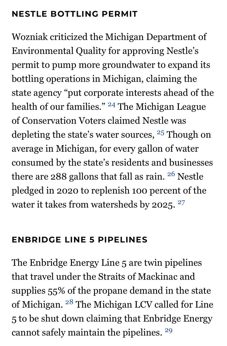 Questionable Claims about Environmental Jobs: “Wozniak wrote an op-ed in the Detroit News on December 12, 2014 where she claimed environmentalist energy had created more than 100,000 jobs in Michigan. The U.S. Bureau of Labor Statistics stated Michigan had 82,644 alternative energy goods and services jobs in 2011, the last year it did such a survey. The Bureau of Labor Statistics defined garbage collectors, bus transportation employees, electricians, plumbers, roofing contractors and organic dairy farmers as belonging to the “green goods and services” sector. In 2012, a ballot proposal to insert a renewable energy mandate into the state constitution was rejected by voters by a 63 to 37 percent margin. Three months before the election, the Michigan LCV claimed in its Political Week In Review blog that the renewable energy mandate ballot proposal would create 94,000 jobs according to a Michigan State University study. The MSU study had claimed the ballot proposal if passed would create 74,495 “job years.” The study explained that it used “job years” and not “jobs” in its calculations and stated that each job was counted for every year it existed in a plant and stated a single manufacturing job could amount to as many as 30 “job years.”” Environmentalist Advocacy: “MCLV board members Kerry Duggan and Phil Roos were appointed in 2021 by Gov. Gretchen Whitmer (D) to serve on a Council on Climate Solutions which will work to implement Whitmer’s climate plan. Whitmer’s target is to have the state achieve “carbon neutrality” by 2050. In June 2021, the Michigan LCV supported the utility Consumers Energy’s plan to shut down all its coal plants by 2025. POLITICAL ENDORSEMENTS: “In 2020, the Michigan LCV endorsed two judge candidates for the Michigan Supreme Court who were supported by Gov. Gretchen Whitmer (D). Fifty-five the 60 state house candidates endorsed by the Michigan LCV in the November 2020 elections were Democrats, as were all nine of the Oakland County candidates the group endorsed.” NESTLE BOTTLING PERMIT: “Wozniak criticized the Michigan Department of Environmental Quality for approving Nestle’s permit to pump more groundwater to expand its bottling operations in Michigan, claiming the state agency “put corporate interests ahead of the health of our families.” The Michigan League of Conservation Voters claimed Nestle was depleting the state’s water sources, Though on average in Michigan, for every gallon of water consumed by the state’s residents and businesses there are 288 gallons that fall as rain. 26 Nestle pledged in 2020 to replenish 100 percent of the water it takes from watersheds by 2025.” ENBRIDGE LINE 5 PIPELINES: “The Enbridge Energy Line 5 are twin pipelines that travel under the Straits of Mackinac and supplies 55% of the propane demand in the state of Michigan. The Michigan LCV called for Line 5 to be shut down claiming that Enbridge Energy cannot safely maintain the pipelines.”