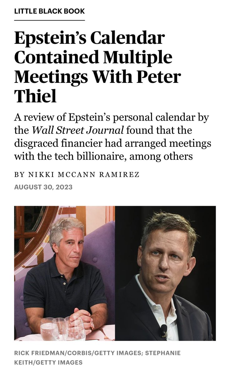 H/T @chiefjimmy45 Epstein’s Calendar Contained Multiple Meetings With Peter Thiel “A review of Epstein’s personal calendar by the Wall Street Journal found that the disgraced financier had arranged meetings with the tech billionaire, among others” https://www.rollingstone.com/culture/culture-news/jeffrey-epstein-peter-theil-thomas-barrack-1234815670/