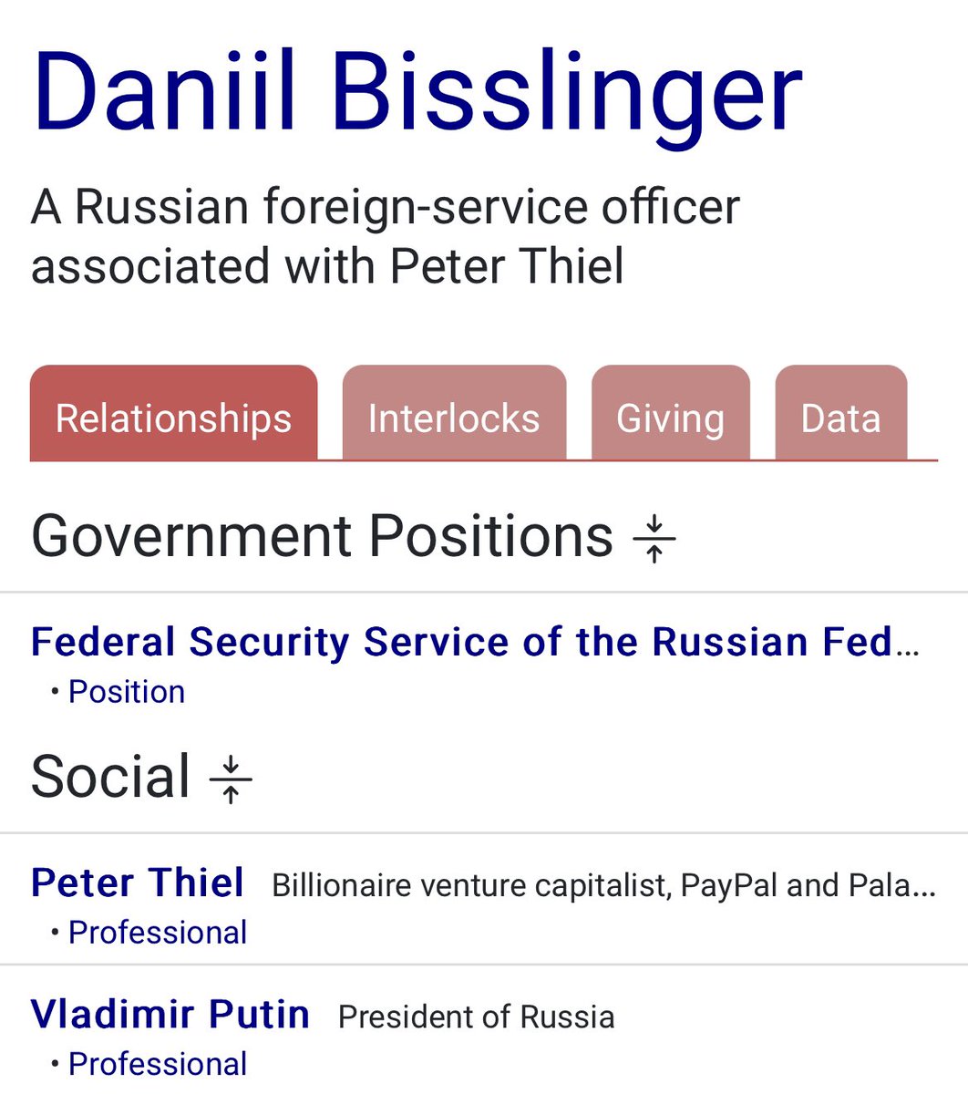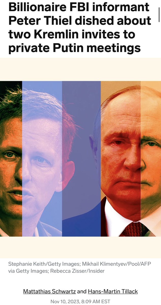 We also find he has connections to Daniil Bisslinger, a foreign service officer for the Federal Security Service of the Russian Federation. Bisslinger tried to arrange meetings between Thiel and Russian President Vladimir Putin on multiple occasions but failed with nothing transpiring from this connection overall in the long run. See article below. H/T @chiefjimmy45 Billionaire FBI informant Peter Thiel dished about two Kremlin invites to private Putin meetings https://www.businessinsider.com/fbi-peter-thiel-vladimir-putin-russia-christian-angermayer-daniil-bisslinger-2023-11 https://littlesis.org/person/438588-Daniil_Bisslinger