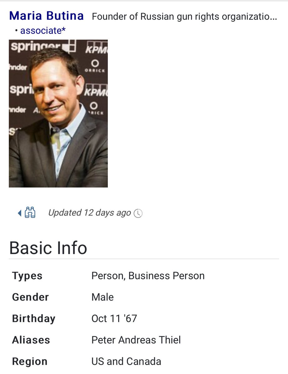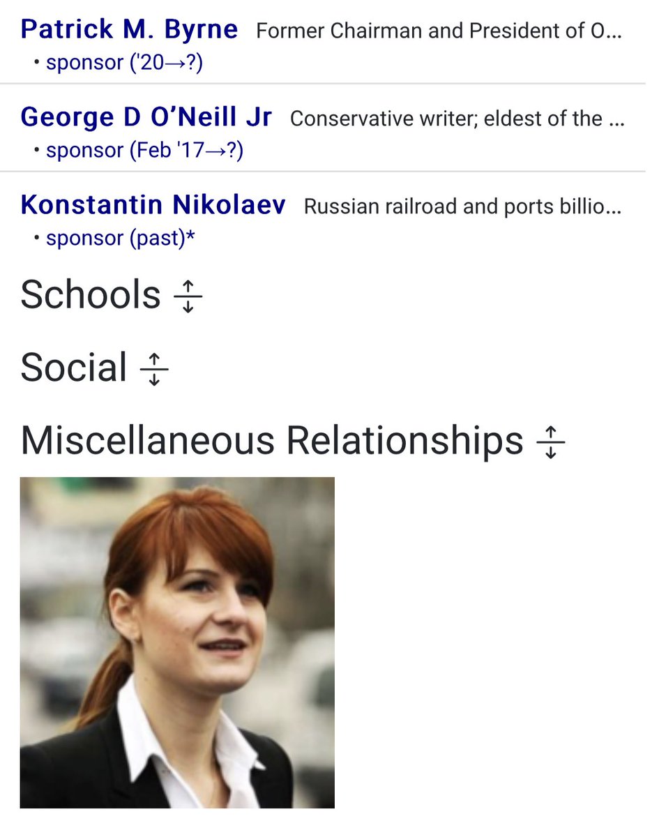 The next connection we have to Thiel is Maria Butina. Flynn network connection? Who’s Butina? Maria Butina is “Founder of Russian gun rights organization Right to Bear Arms. convicted of federal charges, deported to Russia”. She’s also former lover of none other than @PatrickByrne, cofounder of The America Project with @GenFlynn https://littlesis.org/person/276159-Maria_Butina https://littlesis.org/person/87577-Patrick_M._Byrne