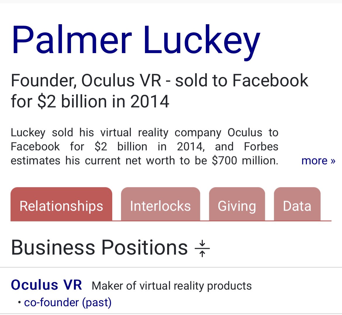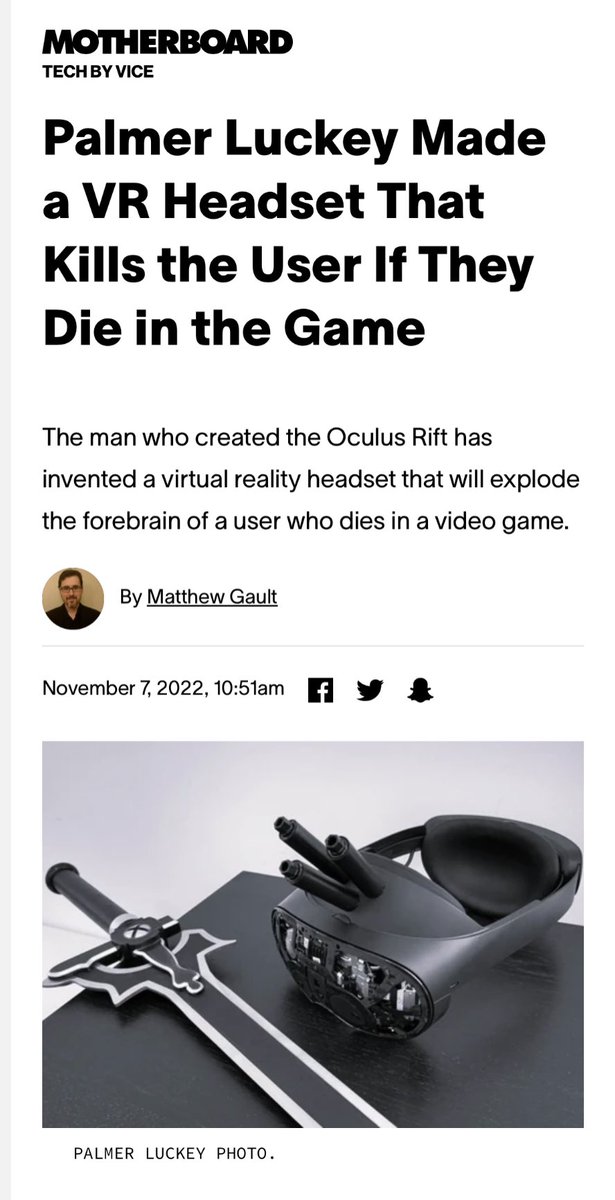 Another connection of Thiel’s is a business associate of his via Meta/Facebook which Thiel became director of in April 2005-?, Palmer Luckey. Luckey is the creator of the virtual reality headset Oculus 2, which in 2014 Meta/Facebook bought for $2 billion dollars. Luckey is also the designer and developer of a explosive virtual reality headset. Palmer Luckey Made a VR Headset That K***s the User If They Die in the Game The man who created the Oculus Rift has invented a virtual reality headset that will explode the forebrain of a user who dies in a video game. https://www.vice.com/en/article/dy7kbq/palmer-luckey-made-a-vr-headset-that-kills-the-user-if-they-die-in-the-game https://littlesis.org/person/158415-Palmer_Luckey
