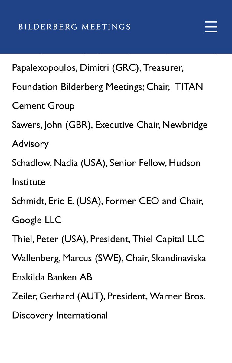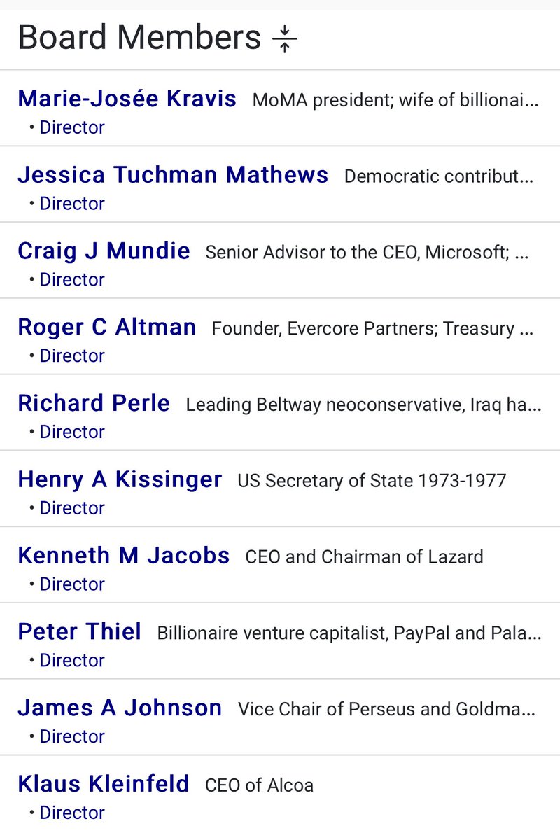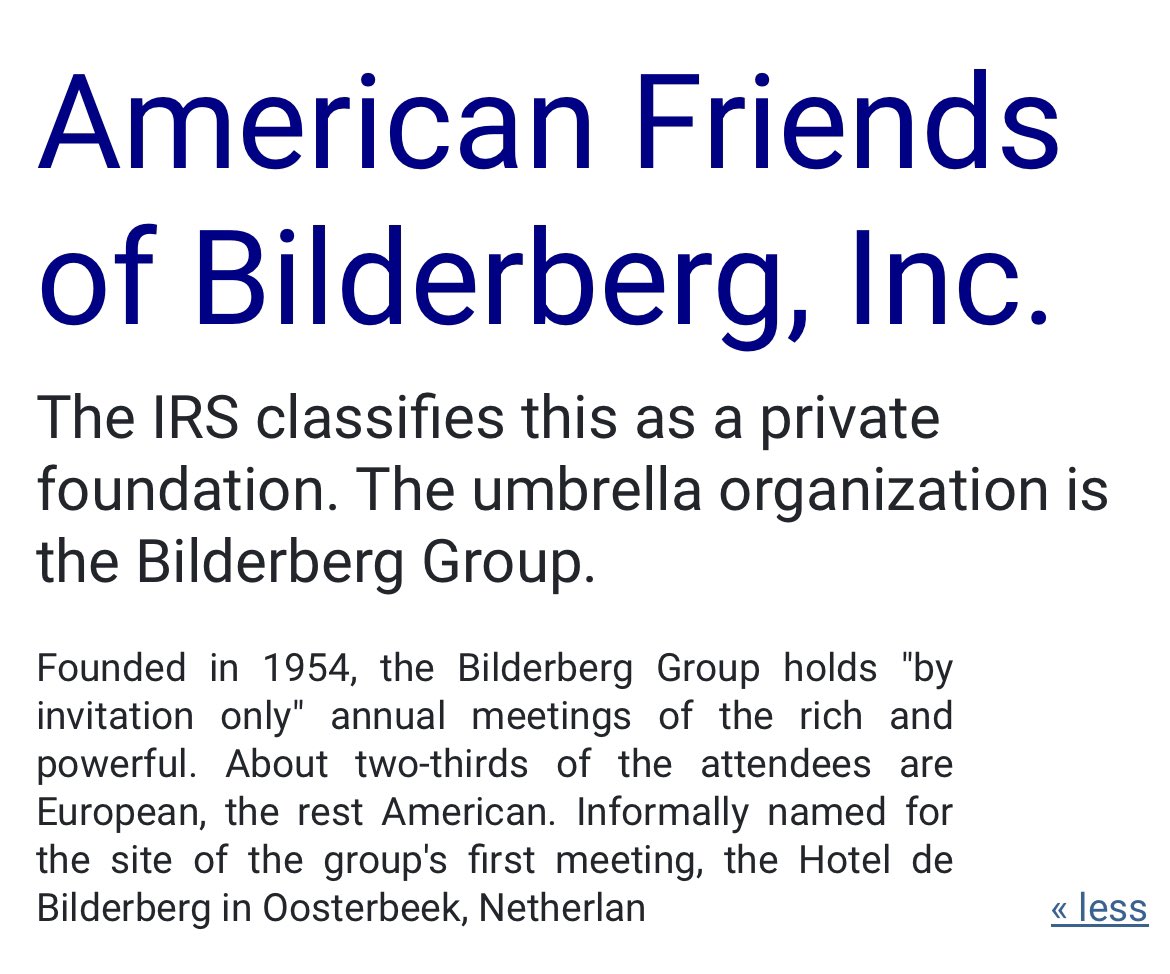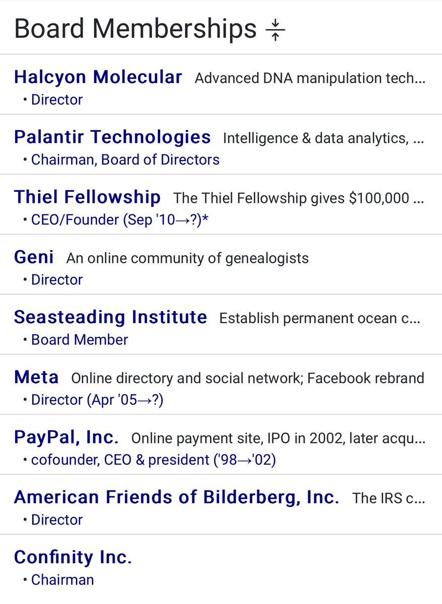 Thiel’s next connection will definitely raise some eyebrows. He’s the director of American Friends of the Bilderberg, Inc., “The IRS classifies this as a private foundation. The umbrella organization is the Bilderberg Group. Founded in 1954, the Bilderberg Group holds "by invitation only" annual meetings of the rich and powerful. About two-thirds of the attendees are European, the rest American. Informally named for the site of the group's first meeting, the Hotel de Bilderberg in Oosterbeek, Netherlands.” Henry Kissinger was also a director of this group. Thiel is even listed on http://bilderbergmeetings.org as a part of the Steering Committee. bilderbergmeetings.org/background/ste… https://littlesis.org/org/43853-American_Friends_of_Bilderberg,_Inc.