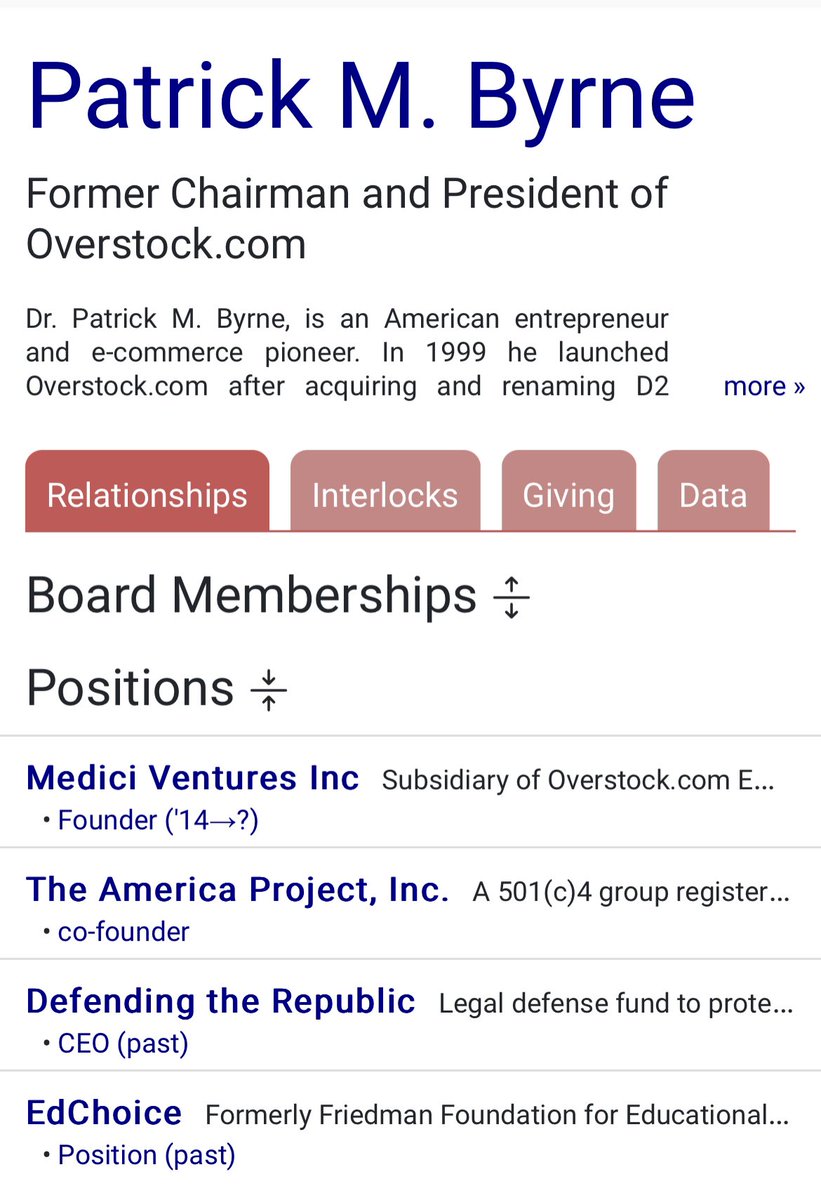 Not sure how many know this, I didn’t myself till just now doing some digging. Not only is @PatrickByrne former chief executive of Overstock, have connections to Jan 6th, and ties to Flynn but apparently Byrne along with Fox’s Maria Bartiromo, General McChrystal, just to name a few are also connected to the Council of Foreign Relations. For those who don’t know what the CFR is: “The Council on Foreign Relations (CFR) is an American think tank specializing in U.S. foreign policy and international relations. Founded in 1921, it is an independent and nonpartisan nonprofit organization. CFR is based in New York City, with an additional office in Washington, D.C. Its membership has included senior politicians, numerous secretaries of state, CIA directors, bankers, lawyers, professors, corporate directors and CEOs, and senior media figures.” https://littlesis.org/person/87577-Patrick_M._Byrne https://littlesis.org/org/33271-Council_on_Foreign_Relations https://en.m.wikipedia.org/wiki/Council_on_Foreign_Relations