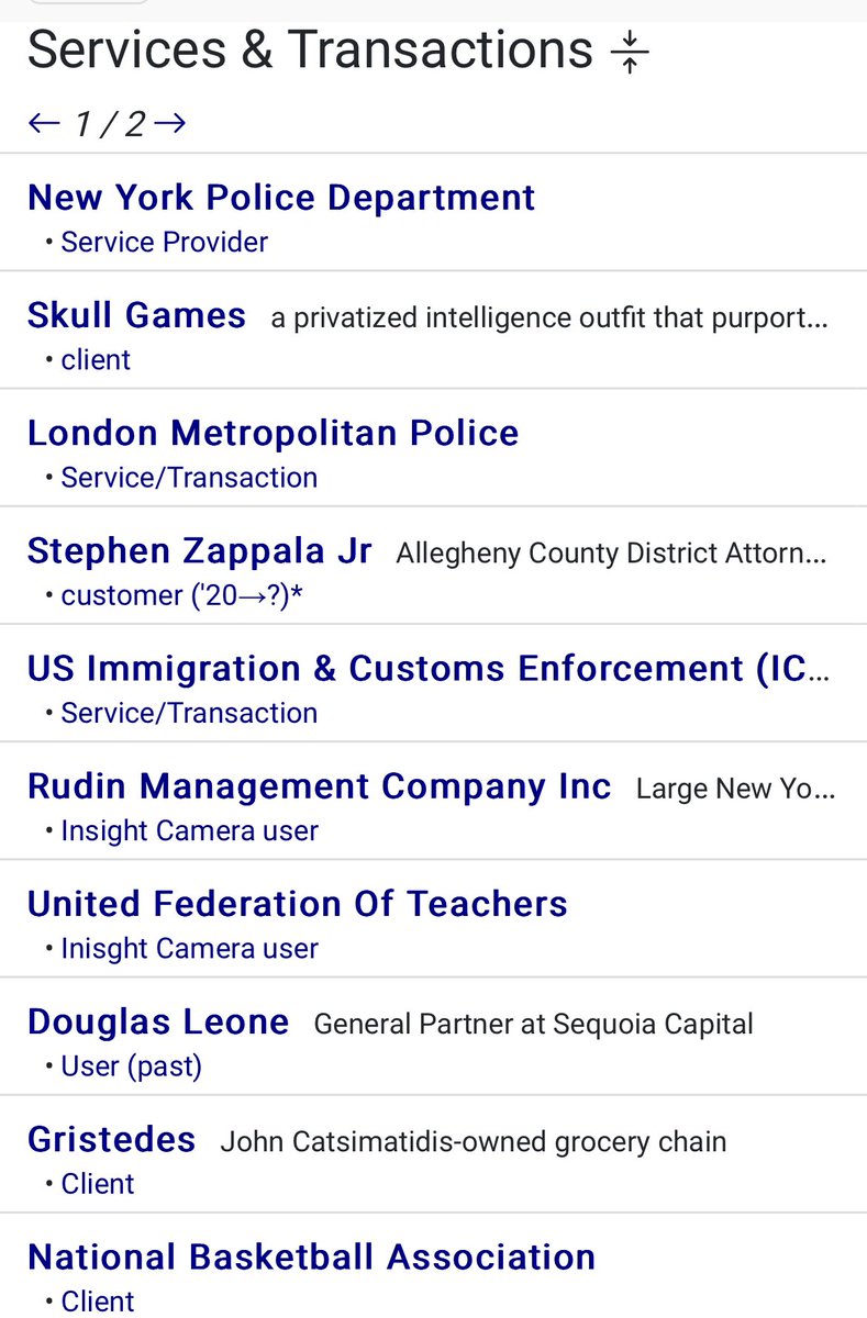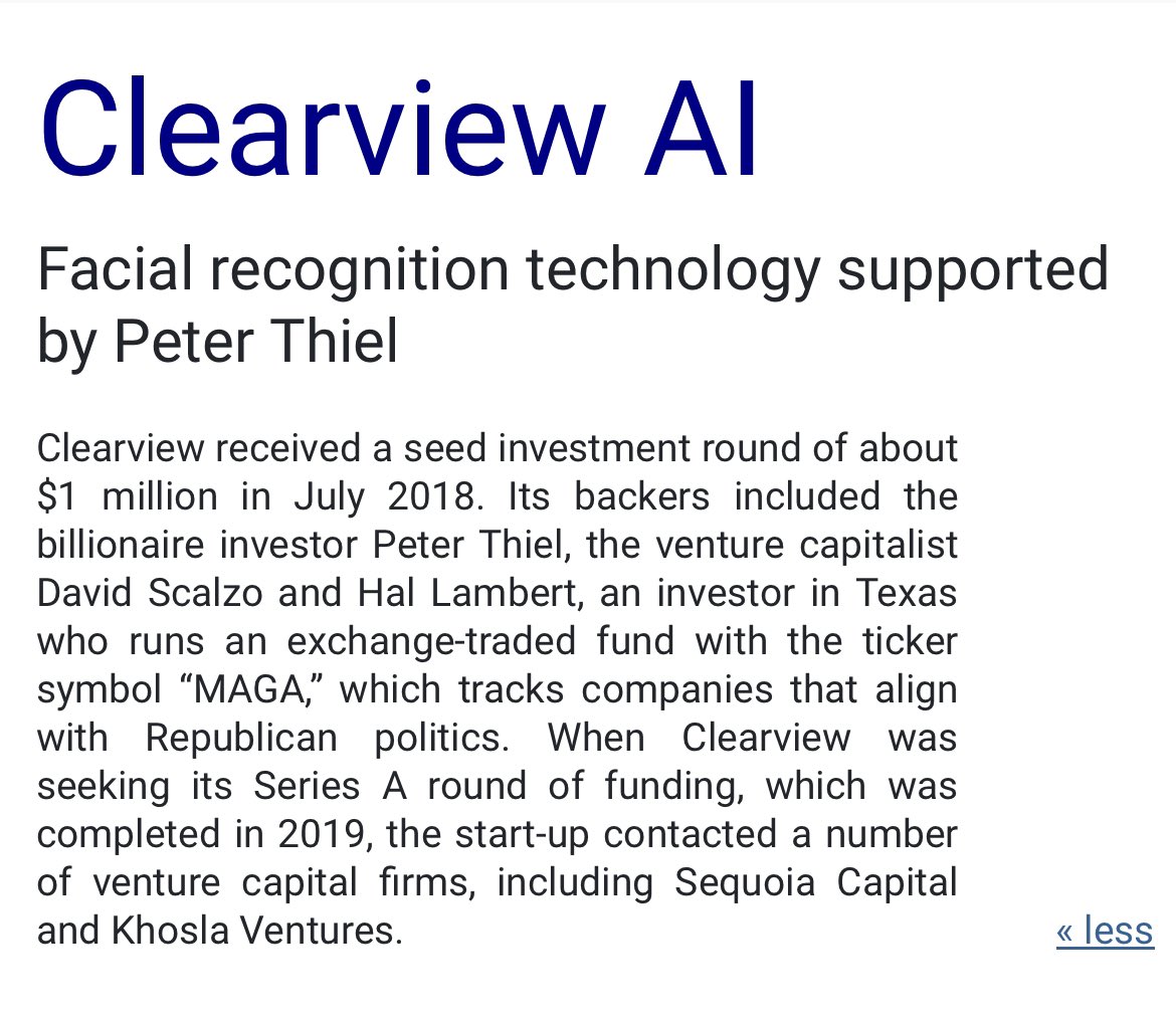 Thiel is also an investor of ClearAI, a facial recognition technology company. ClearAI’s client list includes; NYPD, London Metropolitan Police, ICE, United Federation of Teachers, @NBA, @Kohls, @Macys, and @BestBuy to name a few. https://littlesis.org/org/368882-Clearview_AI
