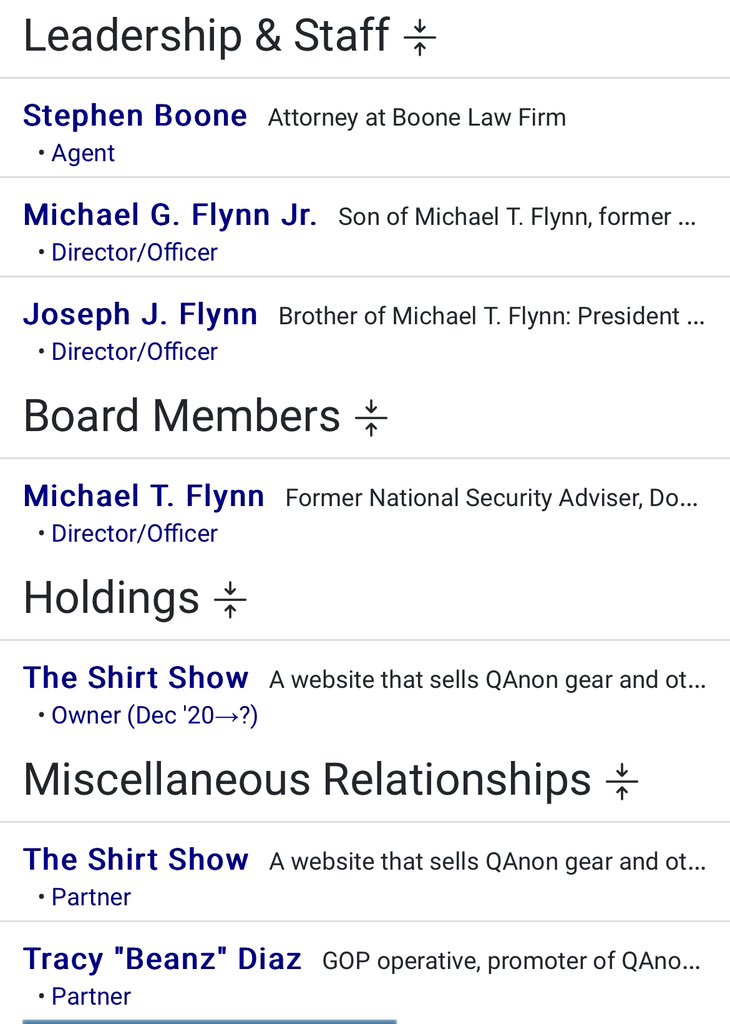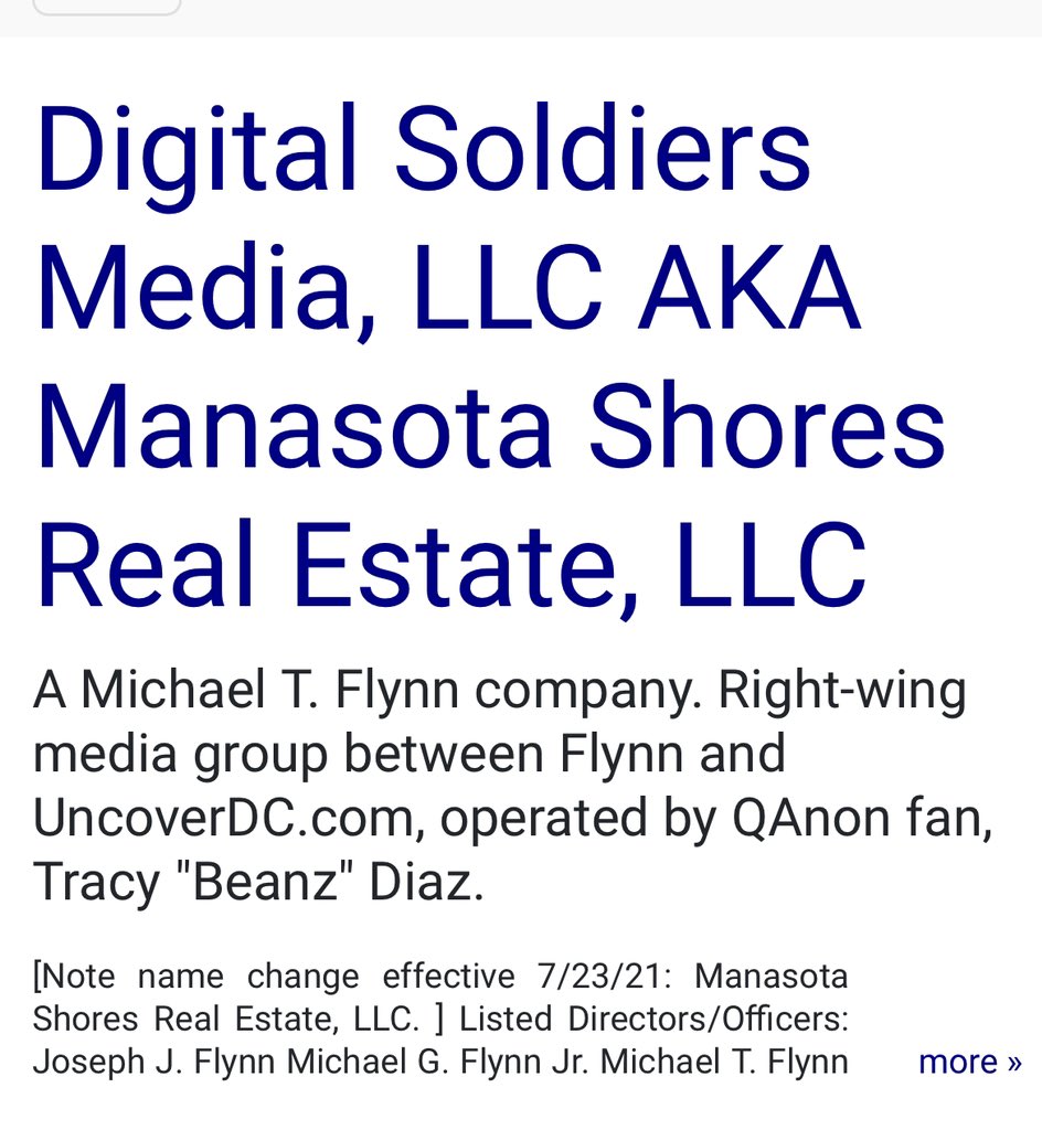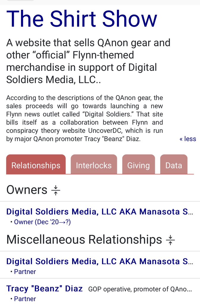 Is it just me or does this sound like an alleged money laundering scheme between General Flynn and @tracybeanz? You know @GenFlynn, you attack Q and Anons and try to say you have nothing to do with the Q movement or as the mainstream falsely dubs it “QAnon” but the problem is; it’s all bullshit especially seeing you made money off the backs of those supporting Q for years. Here’s some more proof I’ve just uncovered: General Flynn is the director/Officer of Digital Soldiers Media, LLC AKA Manasota Shores Real Estate, LLC along with his son @realmflynnJR, brother @JosephJFlynn1, and agent Stephen Boone. When we go down to the Holdings section of Digital Soldiers Media, LLC we find that the Flynn ran company owns “The Shirt Store”. What is “The Shirt Store”? “The Shirt Store” is “A website that sells QAnon gear and other “official” Flynn-themed merchandise in support of Digital Soldiers Media, LLC.. According to the descriptions of the QAnon gear, the sales proceeds will go towards launching a new Flynn news outlet called “Digital Soldiers.” That site bills itself as a collaboration between Flynn and conspiracy theory website UncoverDC, which is run by major QAnon promoter Tracy "Beanz" Diaz.” I’ve seen enough shell companies and laundering schemes to know that something doesn’t smell right and no it’s not the Manhattan Madam either 😂😂 https://littlesis.org/org/415842-Digital_Soldiers_Media,_LLC__AKA_Manasota_Shores_Real_Estate,_LLC https://littlesis.org/org/415869-The_Shirt_Show