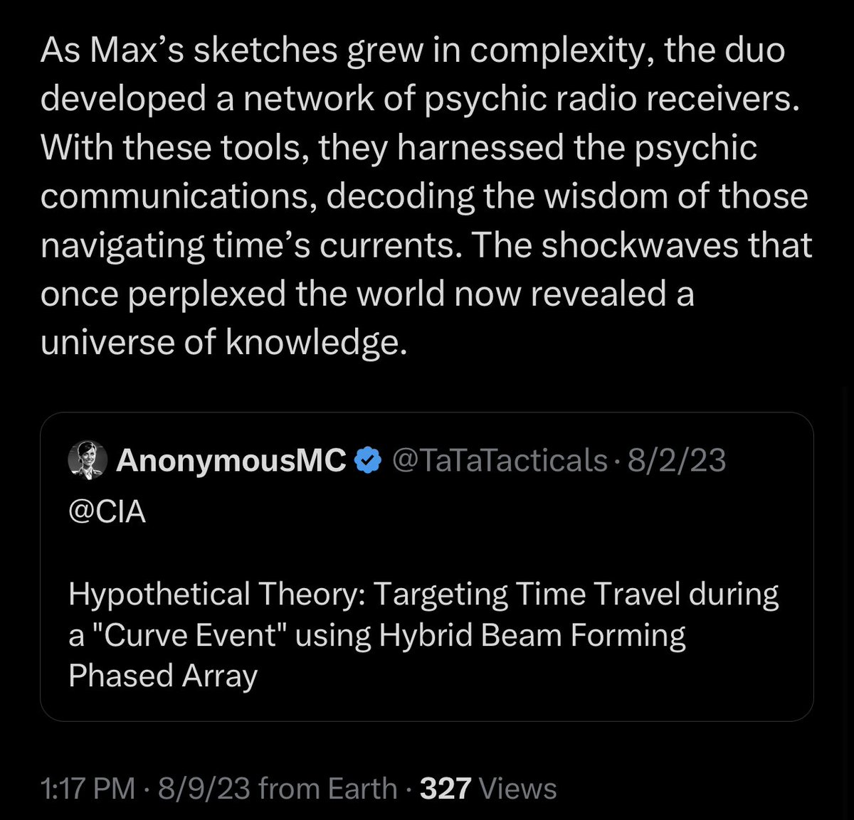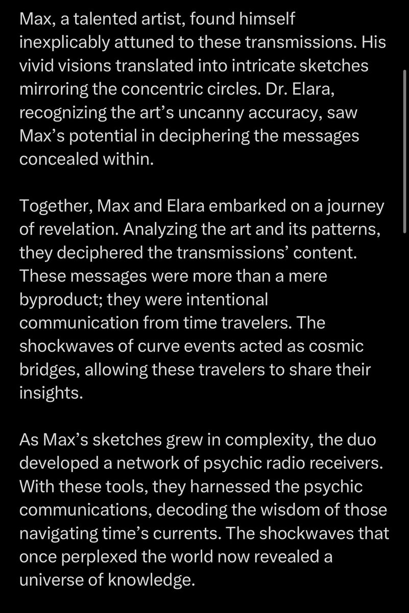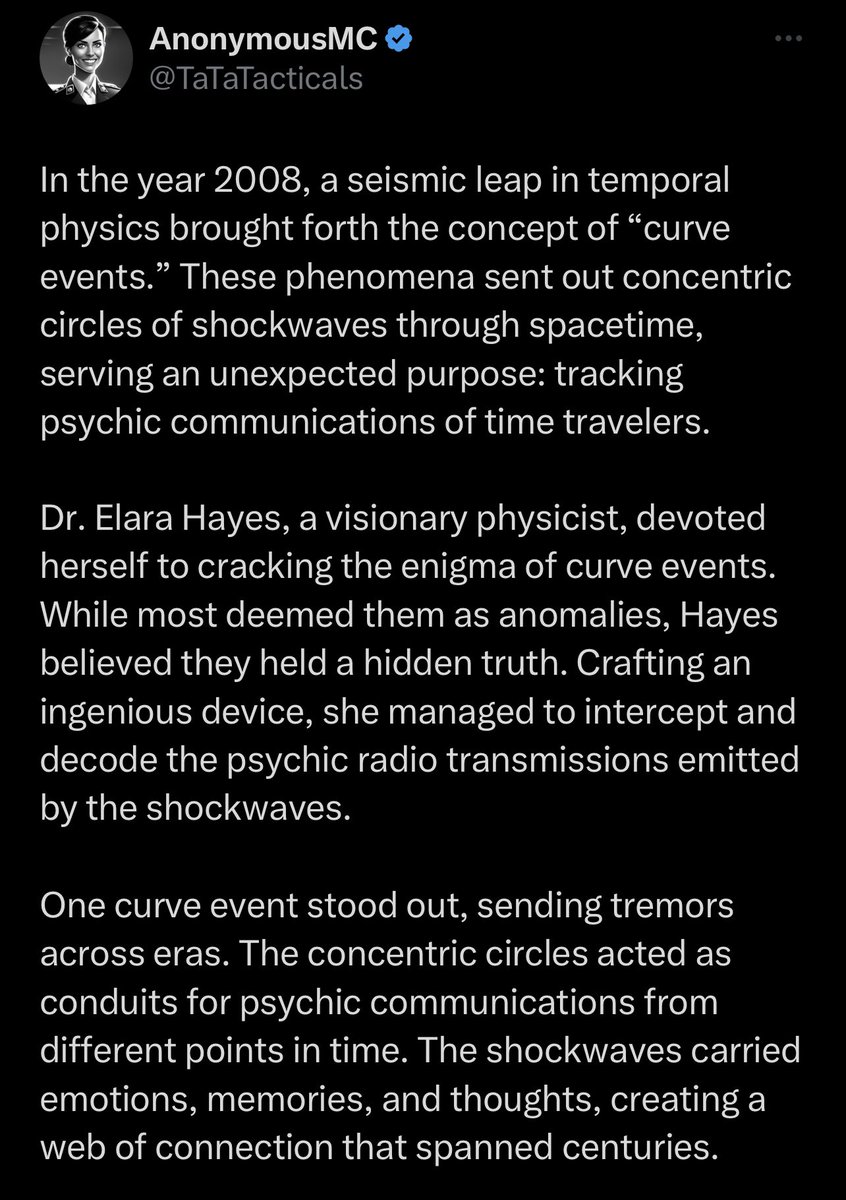 In the year 2008, a seismic leap in temporal physics brought forth the concept of “curve events.” These phenomena sent out concentric circles of shockwaves through spacetime, serving an unexpected purpose: tracking psychic communications of time travelers. Dr. Elara Hayes, a visionary physicist, devoted herself to cracking the enigma of curve events. While most deemed them as anomalies, Hayes believed they held a hidden truth. Crafting an ingenious device, she managed to intercept and decode the psychic radio transmissions emitted by the shockwaves. One curve event stood out, sending tremors across eras. The concentric circles acted as conduits for psychic communications from different points in time. The shockwaves carried emotions, memories, and thoughts, creating a web of connection that spanned centuries. Max, a talented artist, found himself inexplicably attuned to these transmissions. His vivid visions translated into intricate sketches mirroring the concentric circles. Dr. Elara, recognizing the art’s uncanny accuracy, saw Max’s potential in deciphering the messages concealed within. Together, Max and Elara embarked on a journey of revelation. Analyzing the art and its patterns, they deciphered the transmissions’ content. These messages were more than a mere byproduct; they were intentional communication from time travelers. The shockwaves of curve events acted as cosmic bridges, allowing these travelers to share their insights. As Max’s sketches grew in complexity, the duo developed a network of psychic radio receivers. With these tools, they harnessed the psychic communications, decoding the wisdom of those navigating time’s currents. The shockwaves that once perplexed the world now revealed a universe of knowledge.