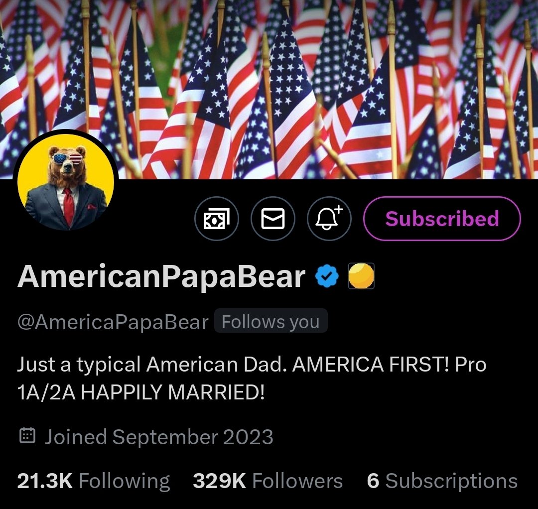 American Papa Bear (@AmericaPapaBear) is an all American father raising patriot children. His content revolves around family values, patriotism, and conservative viewpoints, aiming to inspire and connect with others who share similar ideologies. Follow him and @TheAmerican_Mom https://t.co/AWjLUpOAe2