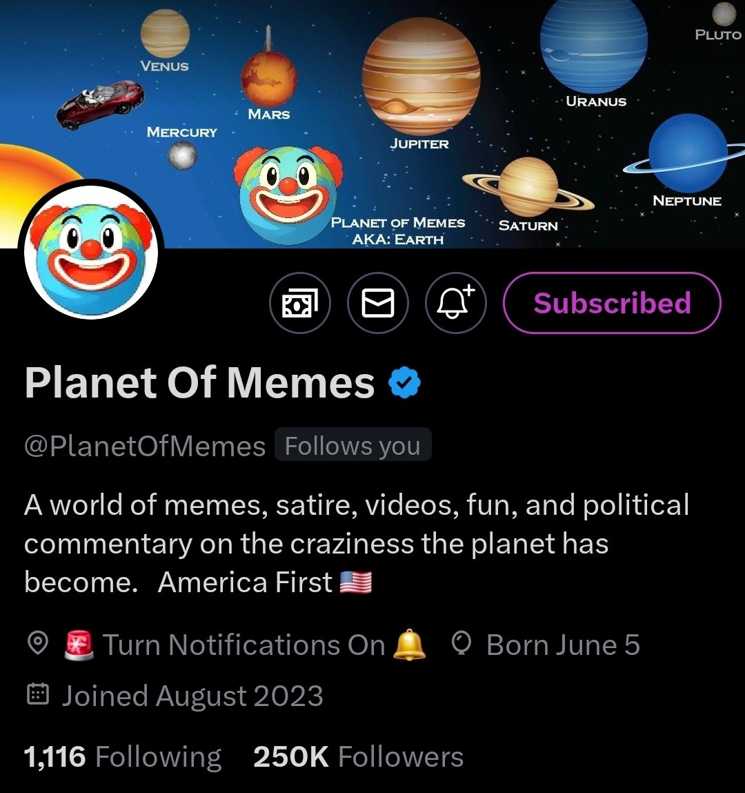 Planet of Memes (@PlanetOfMemes) uses humor, especially through memes, to engage with and influence discussions around politics, societal norms, and cultural trends on X, where political satire and cultural commentary intersect, aiming to both entertain and make a point. Follow! https://t.co/2QVyDr6wgK