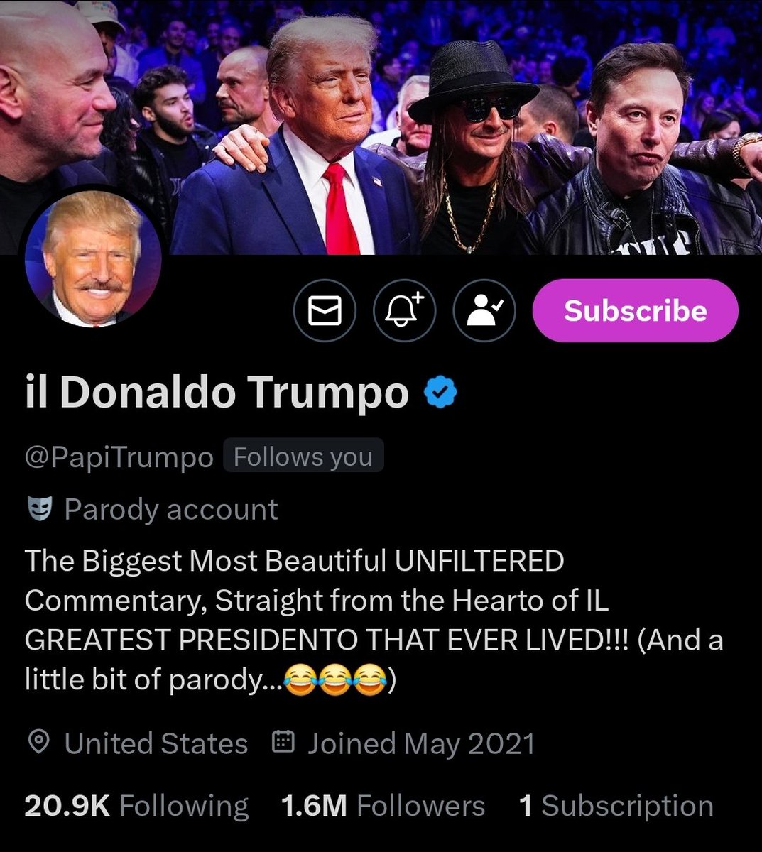 il Donaldo Trumpo (@PapiTrumpo) is a satirical & supportive voice for Donald Trump, blending humor, parody, and political commentary. "The Biggest Most Beautiful UNFILTERED Commentary, Straight from the Hearto of IL GREATEST PRESIDENTO THAT EVER LIVED!!!" A must follow! https://t.co/zLFITctUvj