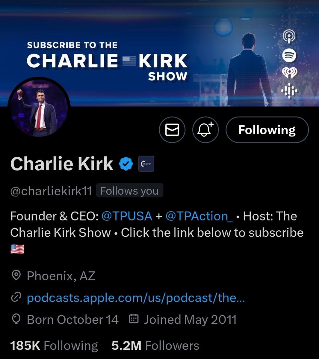 Charlie Kirk (@charliekirk11) is a prominent American conservative political activist, author, and talk show host. He is best known as the Founder and President of Turning Point USA & hosts "The Charlie Kirk Show," a top-rated podcast! Go follow him! https://t.co/14pxIskmeA