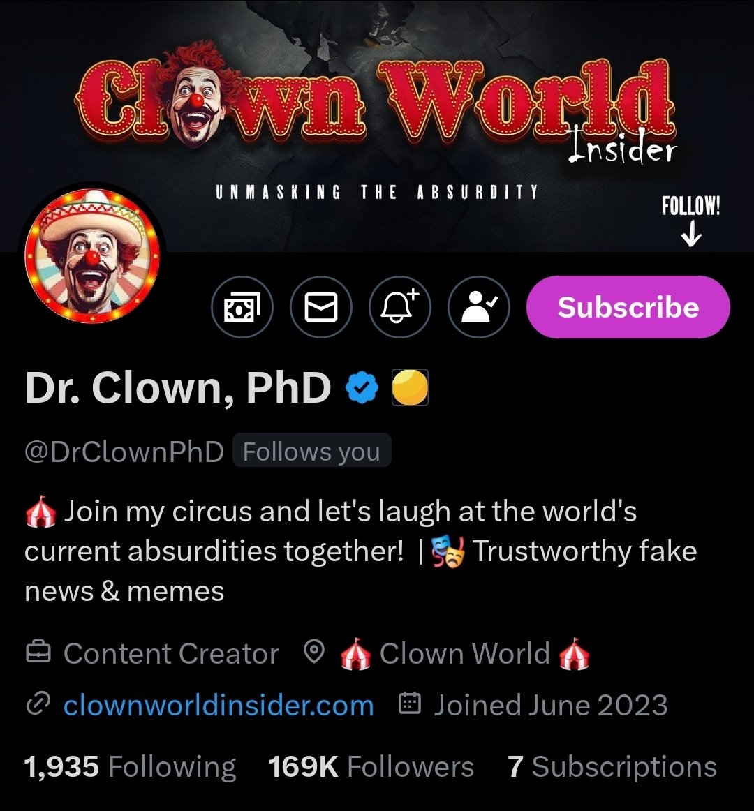 Dr. Clown, PhD (@DrClownPhD) Follow him on X for a unique blend of sharp wit, insightful commentary, and humor that cuts through the noise with a fresh perspective. https://t.co/AKCA9FnveJ