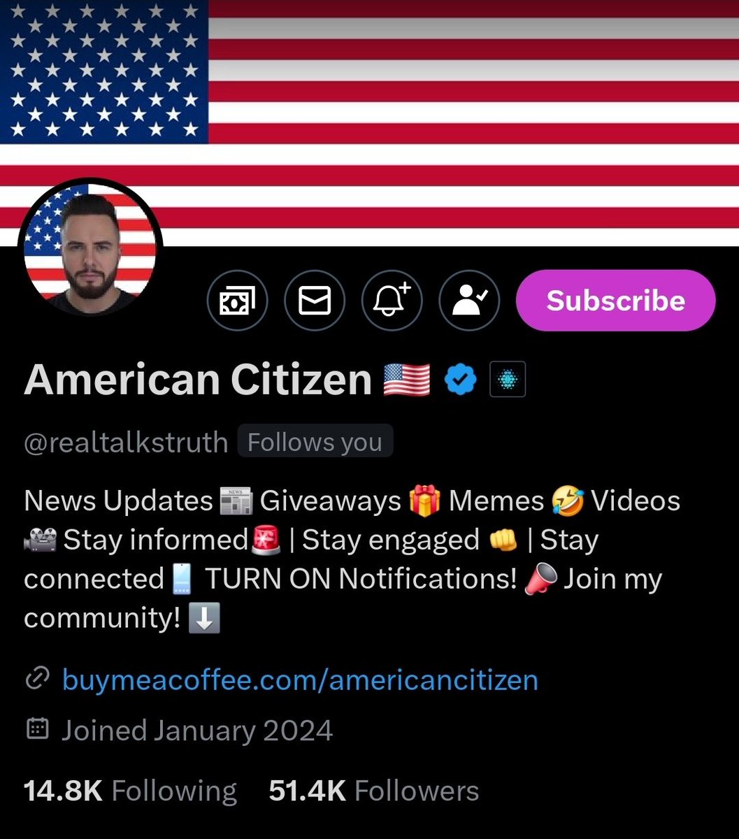 American Citizen (@realtalkstruth) on X is an influential voice for American patriotism, staunchly supporting MAGA and MAHA values. He's dedicated to helping fellow patriots grow their presence on the platform, sharing news updates and advocating for conservative causes. https://t.co/Bc1HT8kxeA