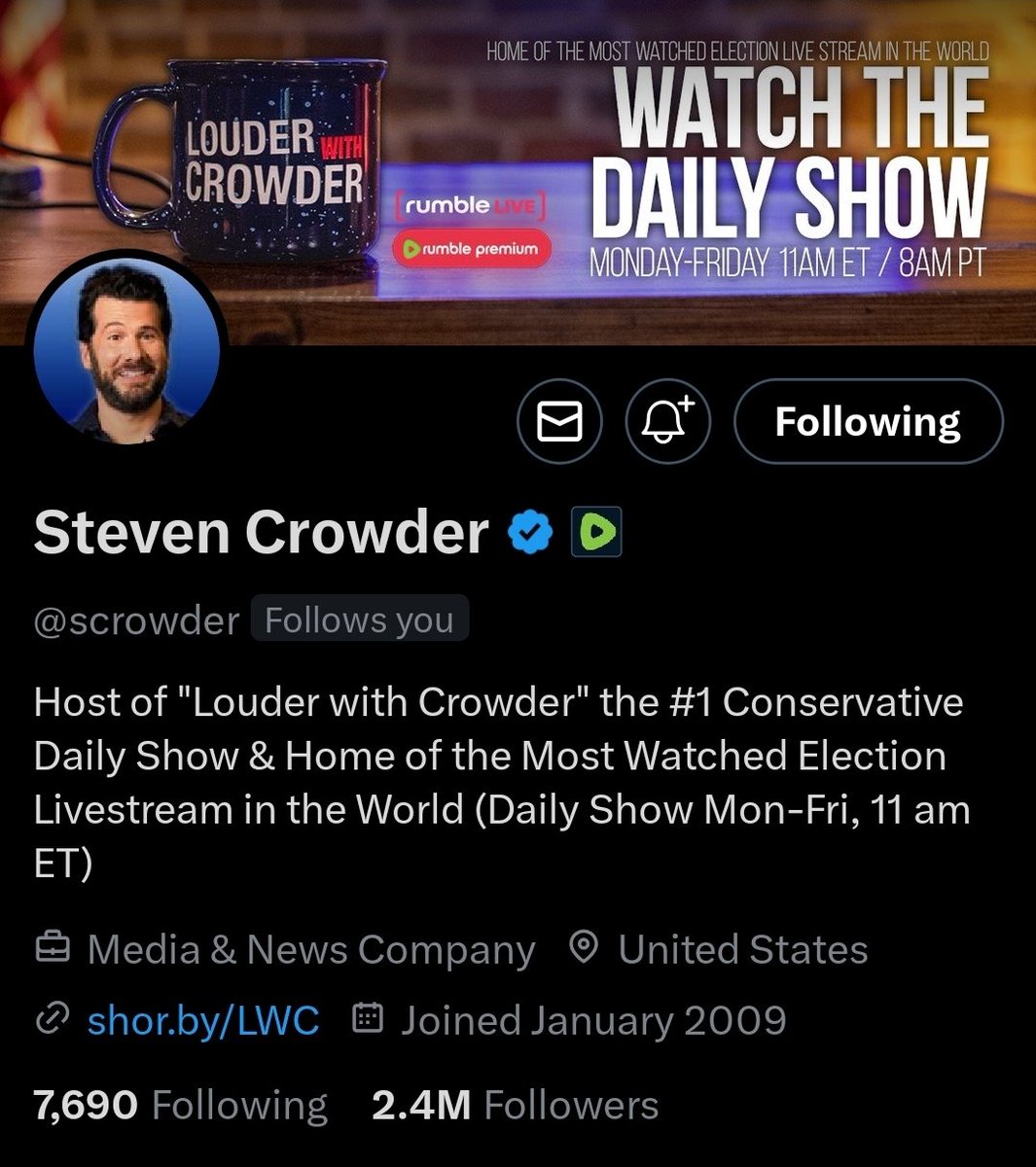 Steven Crowder (@scrowder) He's known for his show "Louder with Crowder," where he dives into political commentary, often with a mix of humor and satire. He's known for pulling back the curtain on liberal biases. Give him a follow! https://t.co/7YswMB75hk