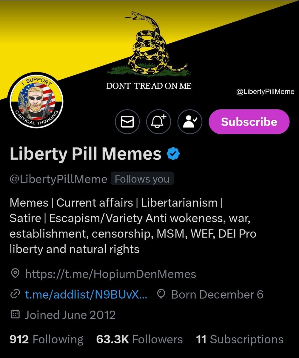 Liberty Pill Memes (@libertypillmeme) aims to entertain, provoke thought, or rally like-minded individuals through humor, satire, and direct commentary on societal or political issues, creating meme culture on X. Give him a follow! https://t.co/noE3c1s7G9