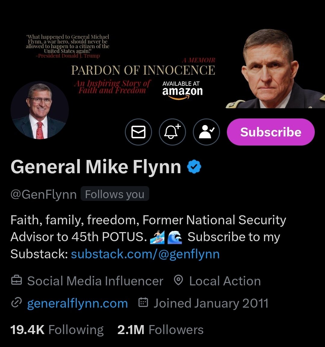 General Mike Flynn (@GenFlynn) touches on sensitive political issues, election integrity, foreign policy, and cultural battles, making him a focal point for debates on X. He's a hero, a victim of political witch hunts, and a defender of traditional American values. Follow him! https://t.co/NnhPDbknUg