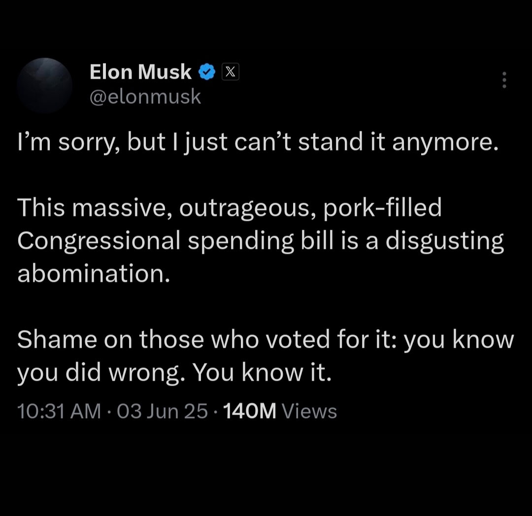 June 3, 2025: Musk escalates criticism of the “Big Beautiful Bill” on X, calling it a “disgusting abomination” and urging followers to lobby against it, highlighting its “pork-filled” spending. https://t.co/UDyNQBfui3