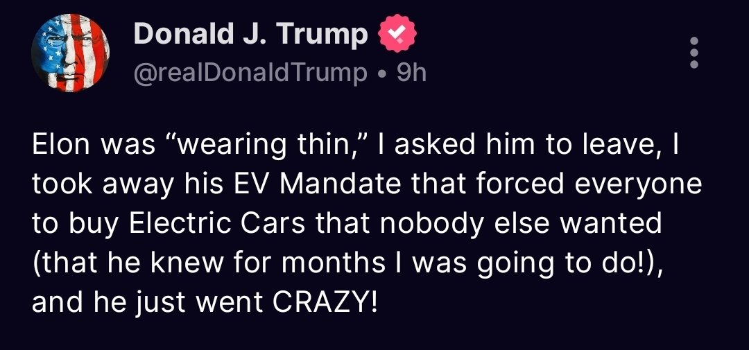 Trump retaliates on Truth Social, saying Musk “went CRAZY” after the EV mandate cut, claiming he asked Musk to leave the administration. Trump threatens to terminate Musk’s government contracts, including SpaceX’s. Tesla’s stock drops 14%, losing $150 billion in value. https://t.co/YAIbHR5VbD