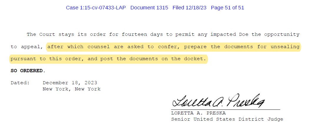 A federal judge has ordered the unsealing of 167 Jeffrey Epstein “John Does” (from Ghislaine Maxwell’s civil case). There’s a lot of confusion (and bad info from the media) surrounding this issue – here is some necessary context on the John Does. Thread. https://t.co/U3QHFTA5d5
