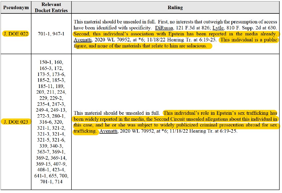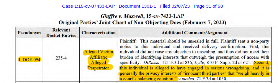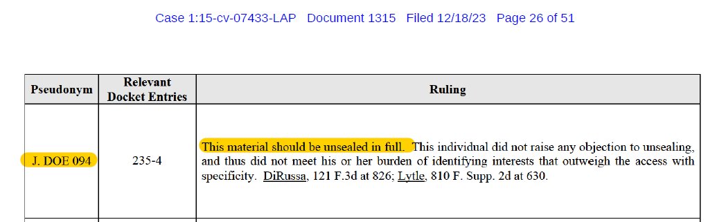 But- There are two alleged perpetrators who haven't been ID'd: John Does 58 and 94 John Doe 58 was previously ID'd as a witness and perpetrator. We noted in Feb 23 that he allegedly had sex with a victim at Epstein's NY mansion The new order says his ID will remain sealed.