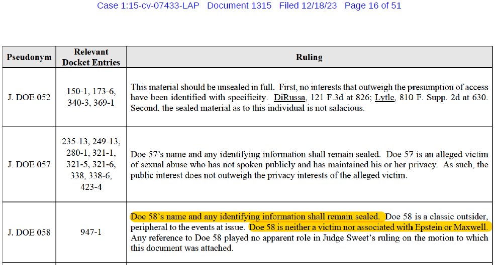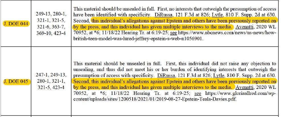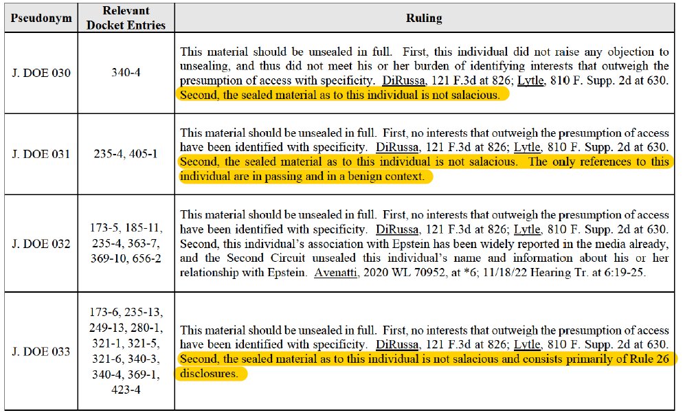 Furthermore - Lawyers for Maxwell and Giuffre (the victim) informed the Court that quite a few of the John Does were only mentioned in passing or in a benign context. Or that “the sealed material as to this individual is not salacious.” Examples: https://t.co/H32N8OpRZr
