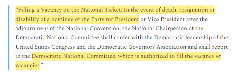 Why that specific timing? Because – Rules adopted by the Democratic National Committee in 2022 leave the DNC as the sole authority to appoint a Presidential nominee where that nominee resigns after the August 2024 convention. No vote or primary needed. https://t.co/unLkP16k09