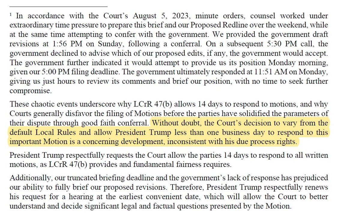 This past week, Judge Chutkan gave Trump’s team one business day to respond to Special Counsel’s protective order (PO). The Court's local rules allow for 14 days to respond. Trump's team asked for more time, citing due process concerns. She denied their requested extension https://t.co/1yAS5u6U4y
