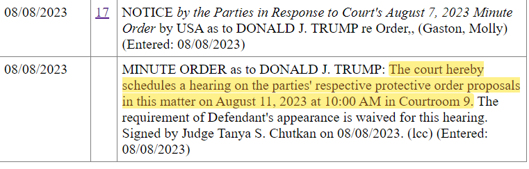 Judge Chutkan also set a hearing on the PO for Aug 11 - Just one week after the PO was submitted, in a case involving millions of pages of documents and hundreds of witnesses. She denied Trump's request for a hearing date where both his lawyers could be president. https://t.co/1VCSLxt5CX