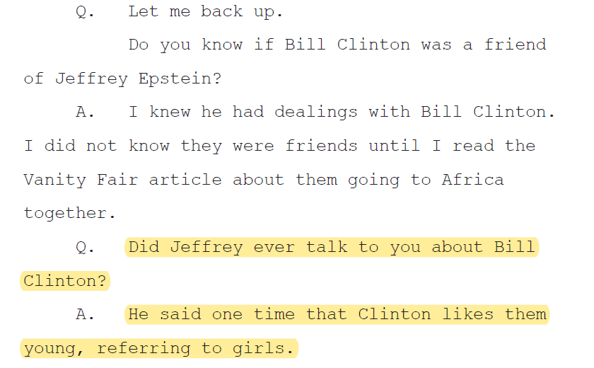 Testimony from one witness: Q: "Did Jeffrey ever talk to you about Bill Clinton?" A: "He said one time that Clinton likes them young, referring to girls." 👀 https://t.co/bAXCWJ44gn