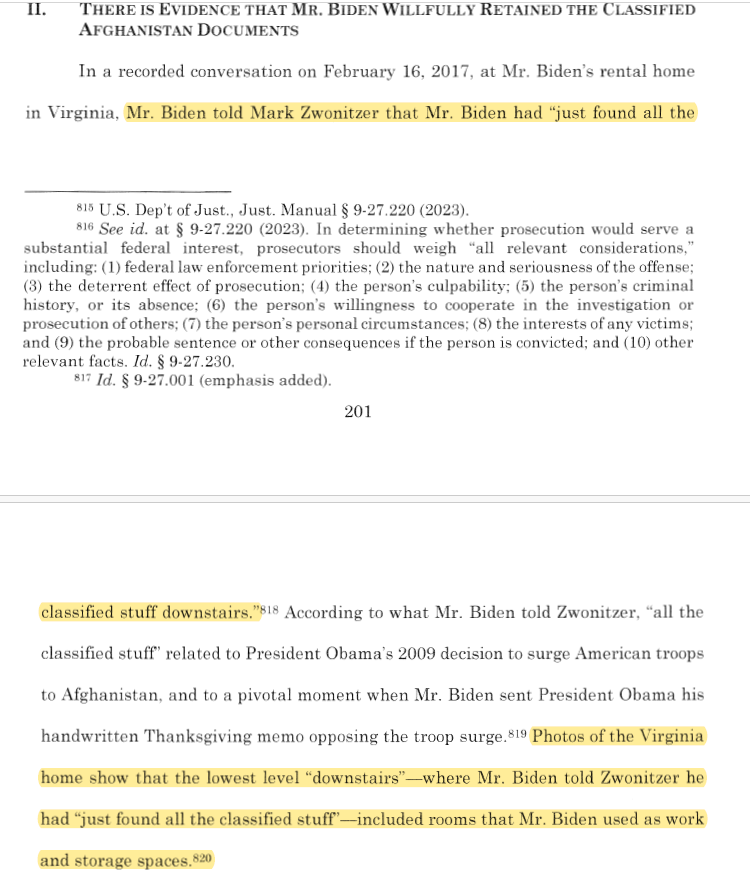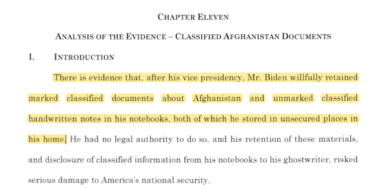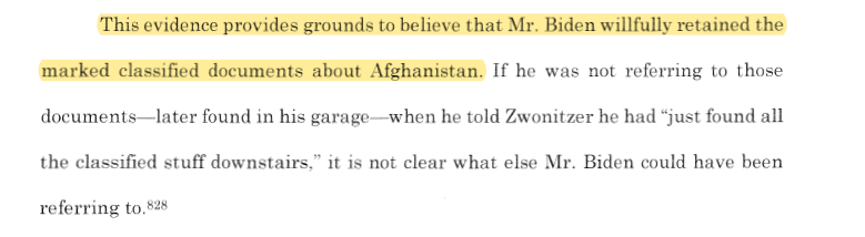 There are tapes: in 2017, Biden told a writer he "found all the classified stuff downstairs" at his Delaware home. These documents were later found by the FBI. Hur: this evidence shows "Biden willfully retained the marked classified documents about Afghanistan." https://t.co/3zbrUkuL99