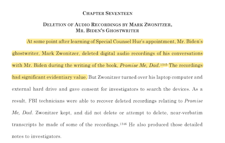 Obstruction of Justice: Biden's ghostwriter "deleted digital audio recordings of his conversations with Mr. Biden" after he learned of Hur's appointment as Special Counsel. Hur declined to press charges.