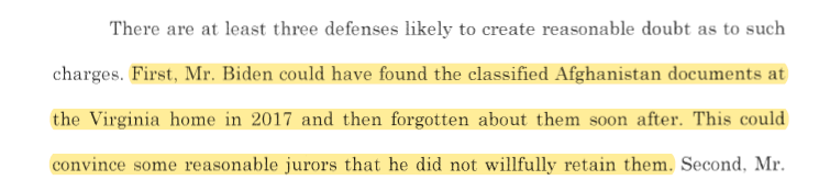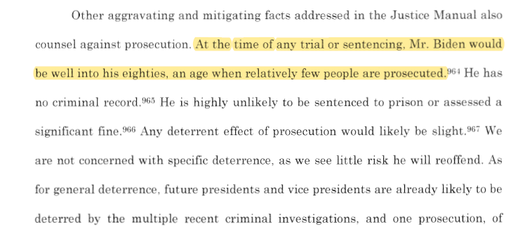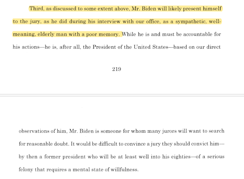 Hur would decline to press charges against Biden for a number of reasons: A jury would not likely convict. Biden is too old to prosecute. A jury could believe he did not willfully retain the docs. A jury would see Biden "as an elderly man with a poor memory." https://t.co/4WrcpaVVmm