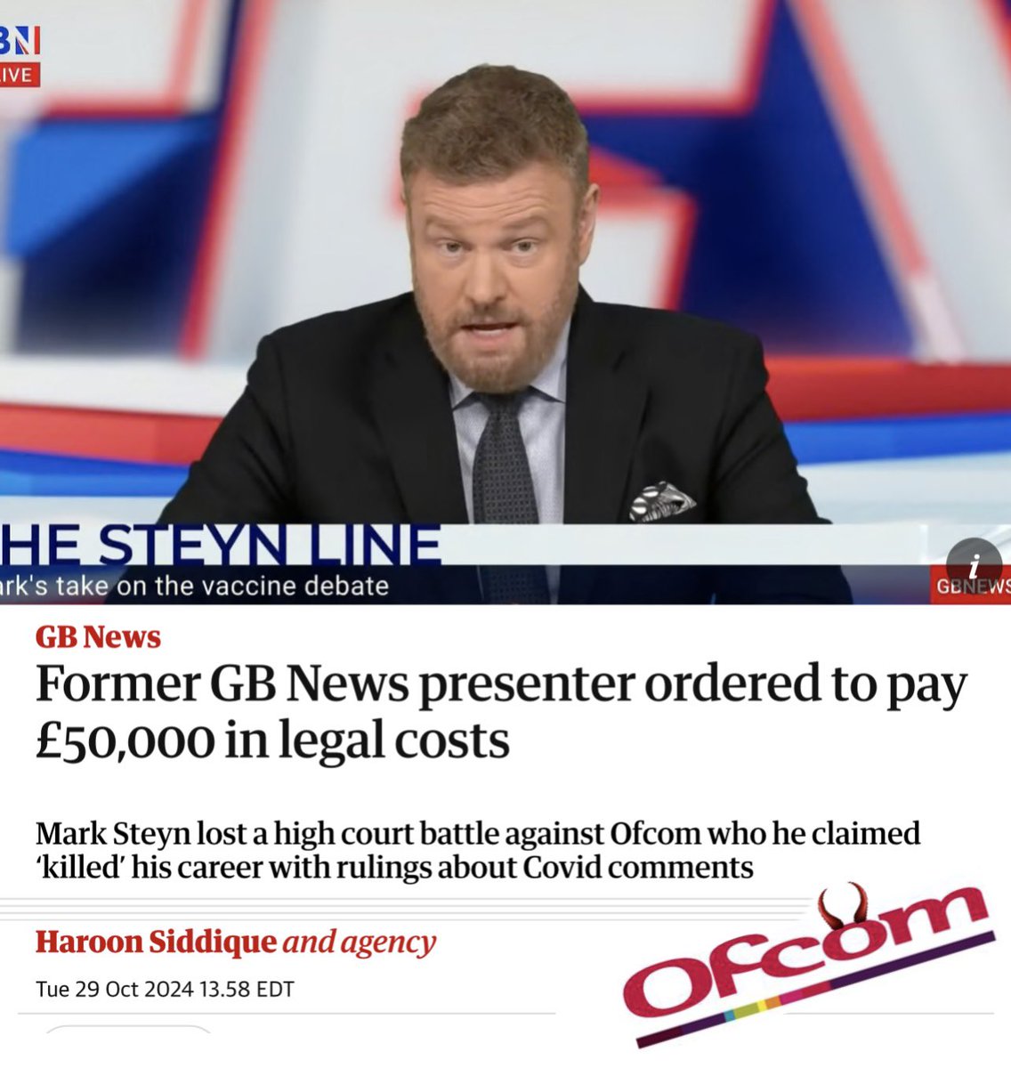 NEW: The evil censors of Ofcom—an Orwellian UK government organization just won their battle in a UK court resulting in a fine for former GBN news anchor @MarkSteynOnline £50,000 for sharing official government data from the UK Health Security Agency about the C•19 shots. Steyn never held anti-vaccine views and even received multiple doses of the C-19 shots as they were required at the time in 2021 & 2022. Subsequently, Steyn miraculously survived two heart attacks in 2022. And although he recovered and returned to his job—his reporting on government health data led to him being fired from GBNews after pressure from Ofcom. Ofcom accused Steyn of breaching their rules as it gave a “materially misleading interpretation” of the figures, which risked “harm to viewers” and won their battle in UK court. Ofcom did not accuse Steyn of presenting invalid data—again the data he shared on during a monologue was from the official UK Health Agency’s website—but that his interpretation of the data was harmful and might’ve led to vaccine hesitancy. Organizations like Ofcom are the enemy of free speech and a free society. But organizations like these are l precisely why so many people are turning to X, podcasts and alternative news outlets to get unfiltered information that they can decide and decipher information for themselves. Censorship is always the enemy of the people.