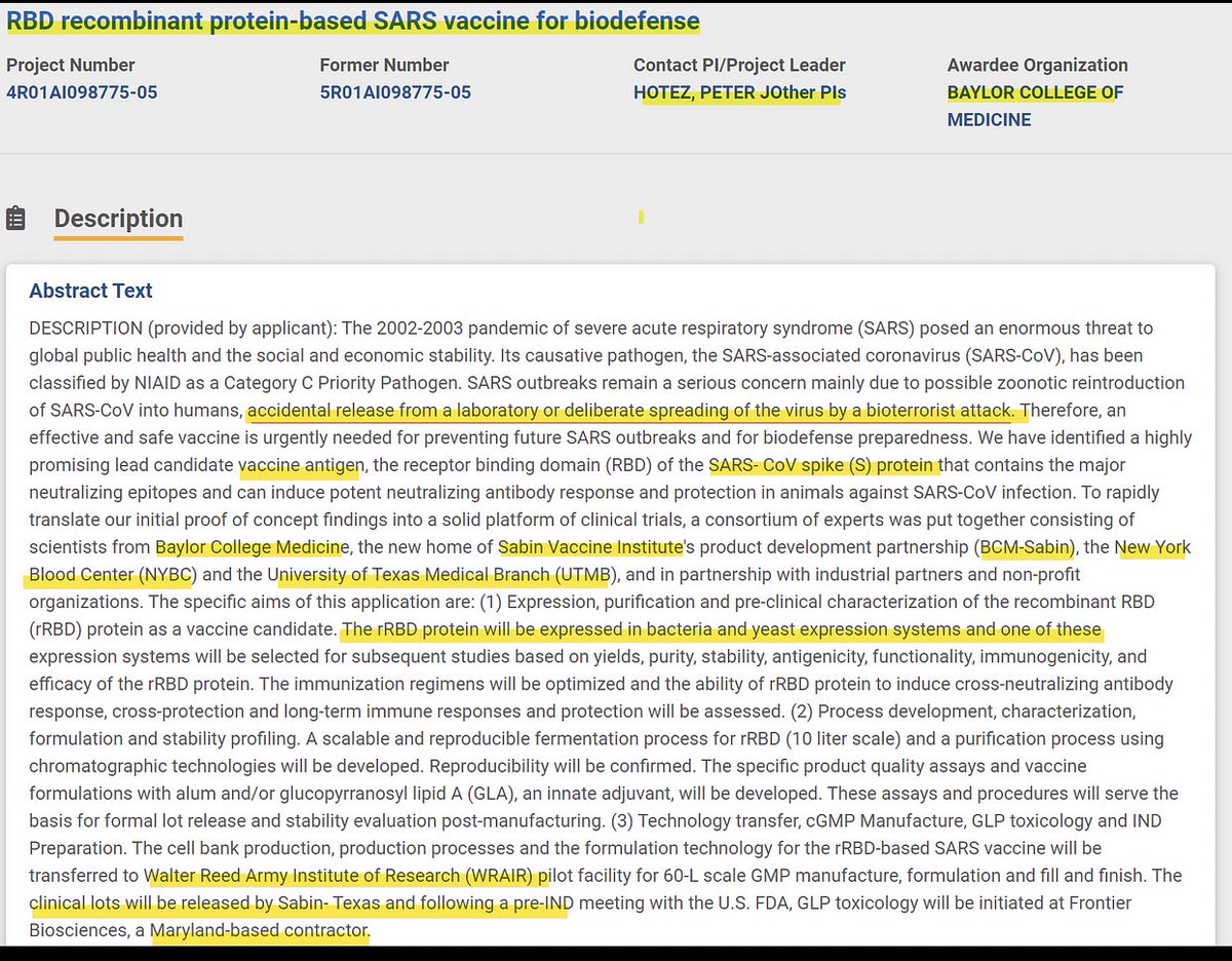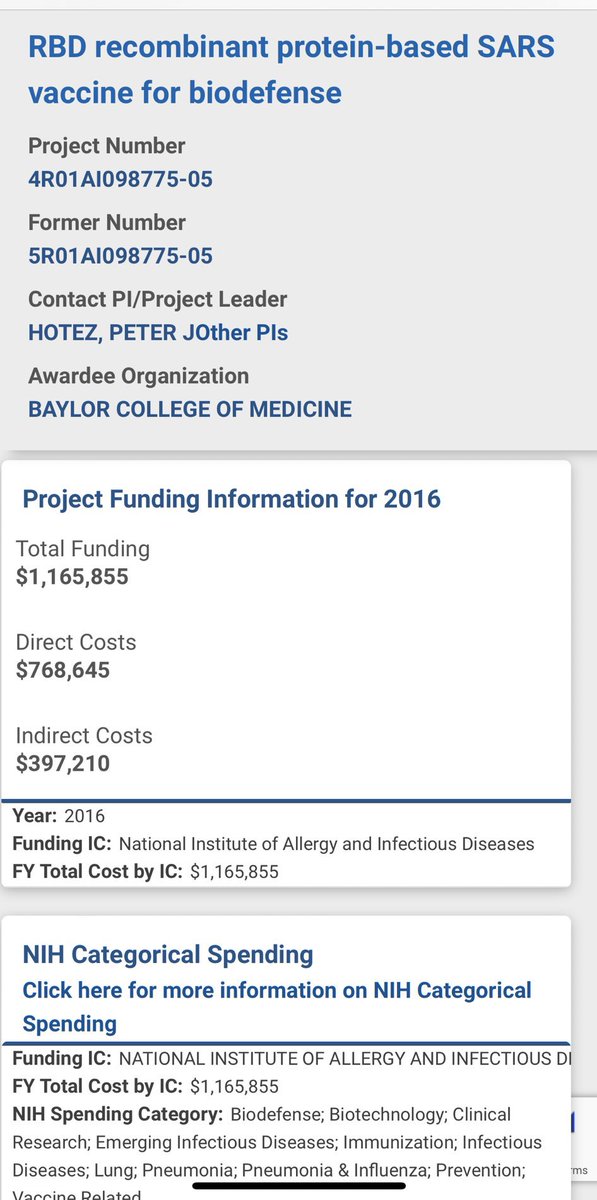 NIH Category: Biodefense research for a SARS protein based vaccine from Fauci’s NIAID, awarded to Peter Hotez at Baylor https://reporter.nih.gov/search/WNMviEkAEk-ohjdU9a9JTg/publications/project-details/9056977