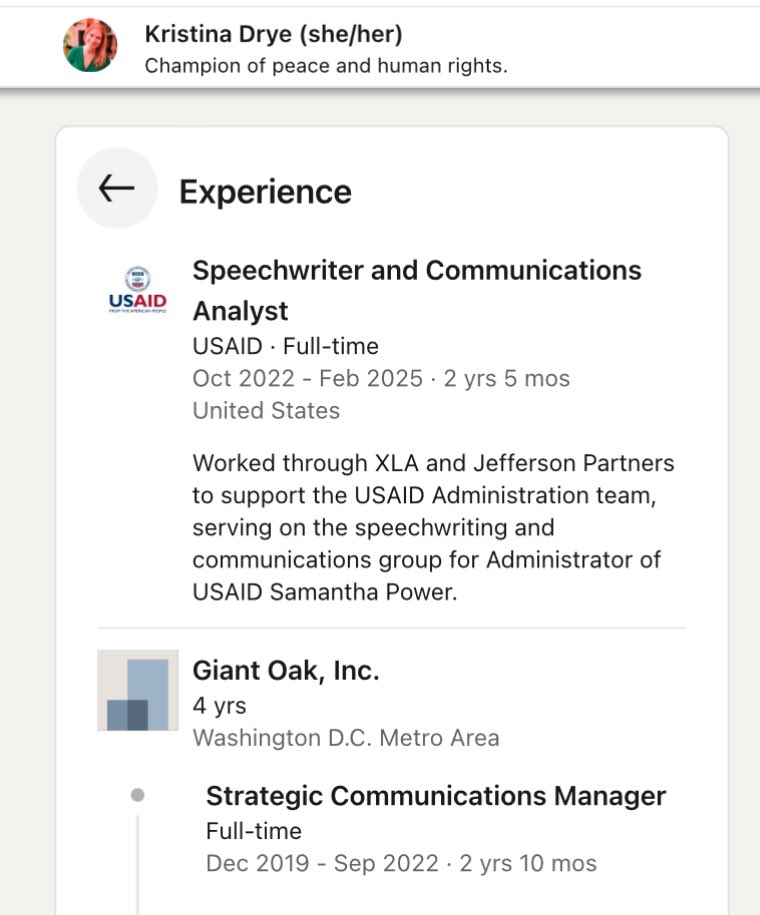 Kristina Drye (she/her) claims to be a “National Security professional” on LinkedIn. Turns out she was a speechwriter for USAID’s director Samantha Powers. But before USAID, Drye worked for Giant Oak, Inc. (GOI)—an international intelligence gathering firm. GOI claims to sweep the internet to monitor the world population and “helps close windows of vulnerability” by finding “negative news in chat rooms, social media and discussion websites, the deep web, and articles or sources in foreign languages” which they claim “makes the world a safer place.”