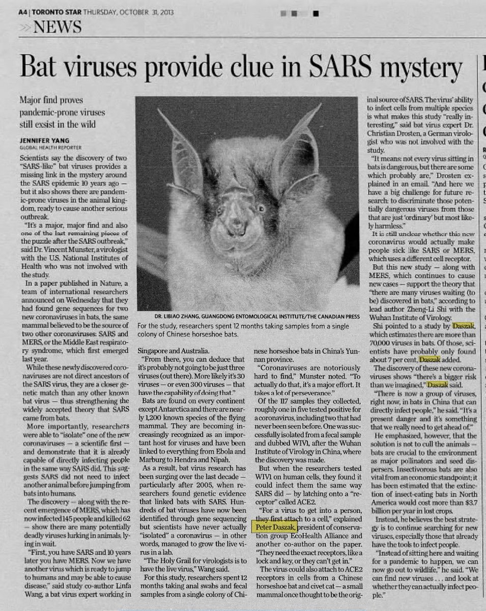 Back in 2013, Peter Daszak (the man Fauci Funded to do high risk SARS coronavirus research in Wuhan) said: "Instead of sitting here & waiting for a pandemic to happen, we can now go out to wildlife. We find new viruses... and look at whether they can actually infect people." Also quoted in the article is Wuhan Institute of Virology’s Shi Zheng-Li aka “Bat Lady” and German virologist, Christian Drosten—who both played a role in the coverup of the Origins that ensued once the pandemic began.