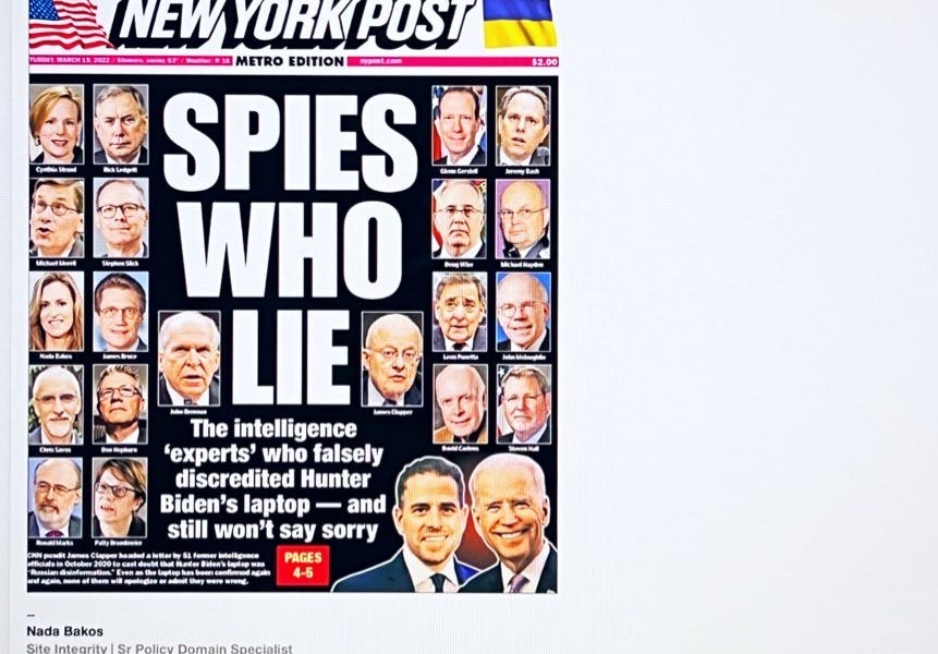 4) When the NY Post story “SPIES WHO LIE” dropped on Saturday, March 19, 2022, Bakos didn’t waste anytime—despite it being the weekend. She emailed her fellow Intel colleagues at Twitter that morning to alert them that her picture was featured on the Cover of the NY Post. — From: Nada Bakos, Sr. Policy at Twitter To: Protective Intelligence & 3 Others Subject: NY Post Story Email: “Hi All - I wanted to make you aware of the NYPost cover that I was 'featured' on related to the Oct 2020 story about Hunter Biden's emails when he was on the Board of the Ukrainian Gas company, Burisma and a letter signed by 100s of former IC officials. (Twitter also banned the NYPost for the story at the time). Given my Policy role (and currently doing enforcement) across CHA-O, I didn't want this to come as a surprise. I don't /haven't publicly acknowledged working for Twitter and locked down my Linkedin. My mentions are a mess, of course. If you have suggestions or anything I need to do, please let me know. I have no plans to respond/make a statement or acknowledge the piece. Nada”
