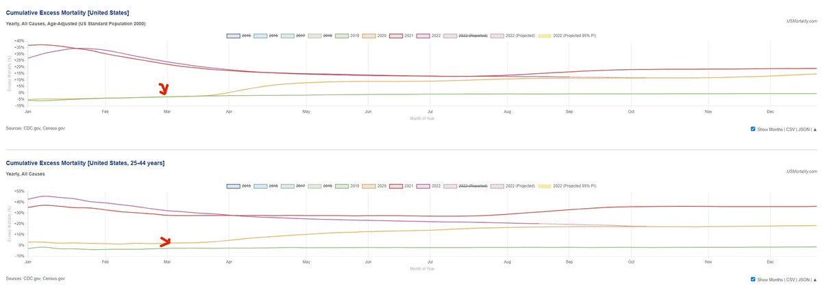 Now I will share the graphs + Data. The graphs I am sharing here are for total US excess deaths all ages, as well as 0-24 specifically. (CDC) I have put a red mark at the date of the first mRNA vaccine that was given. March 16, 2020. See legend at top, steep increases after⦠https://t.co/sy0OecSnSP