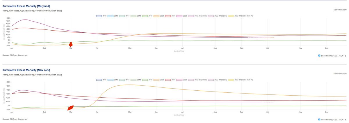 Two stateβs, MD and NY, both are highly vaccinated states. (All ages) I have marked the start date again on both. After the start date of March 16, 2020 you can see the increase (see legend on top) about a month later. (data is from CDC). 3 months after start, deaths up 12.3%. https://t.co/zQXcwi7wvX