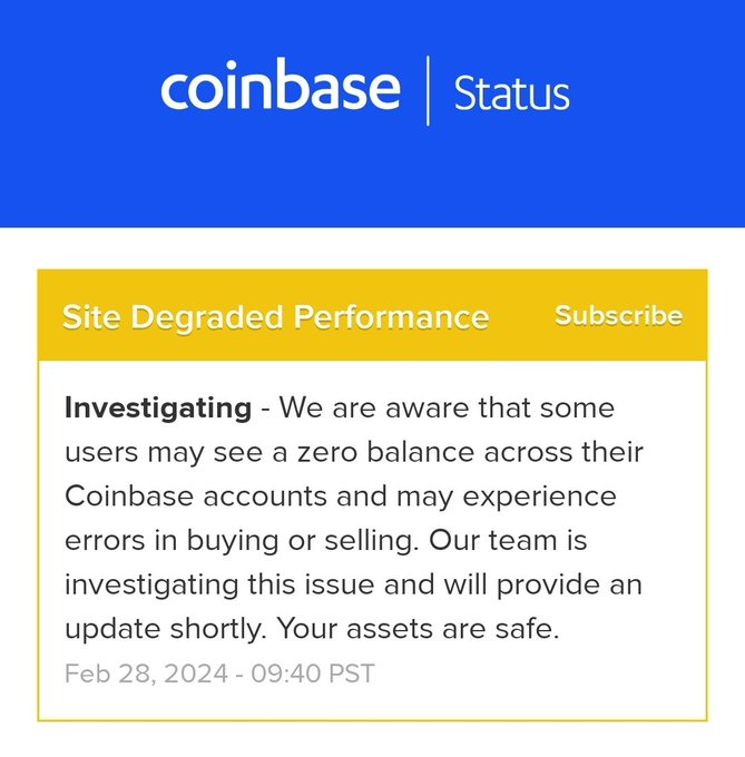 UPDATE = Coinbase on zero balance: "Your assets are safe." https://t.co/JZDvePkRuE