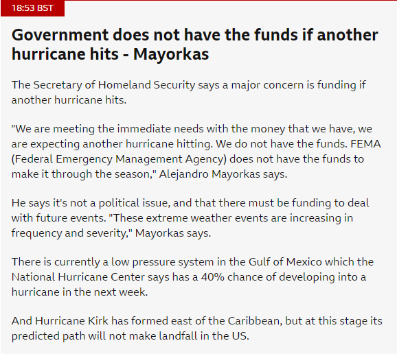 MORE: "We are meeting the immediate needs with the money that we have, we are expecting another hurricane hitting. We do not have the funds. FEMA (Federal Emergency Management Agency) does not have the funds to make it through the season," Alejandro Mayorkas says - BBC https://t.co/b9wt8Q4YXN
