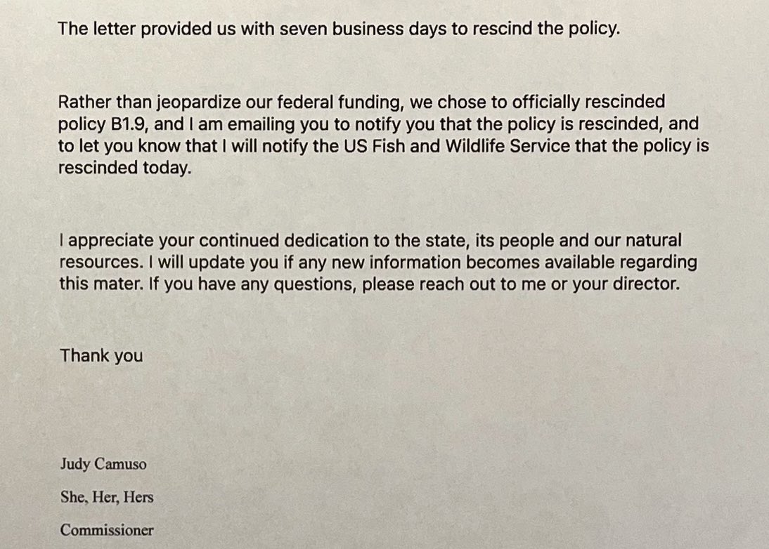 Update: The Mills Admin DIFW has immediately rescinded a sex-based quota policy the Trump Admin alleged was a violation of civil rights. https://t.co/7O1gmeaKoO