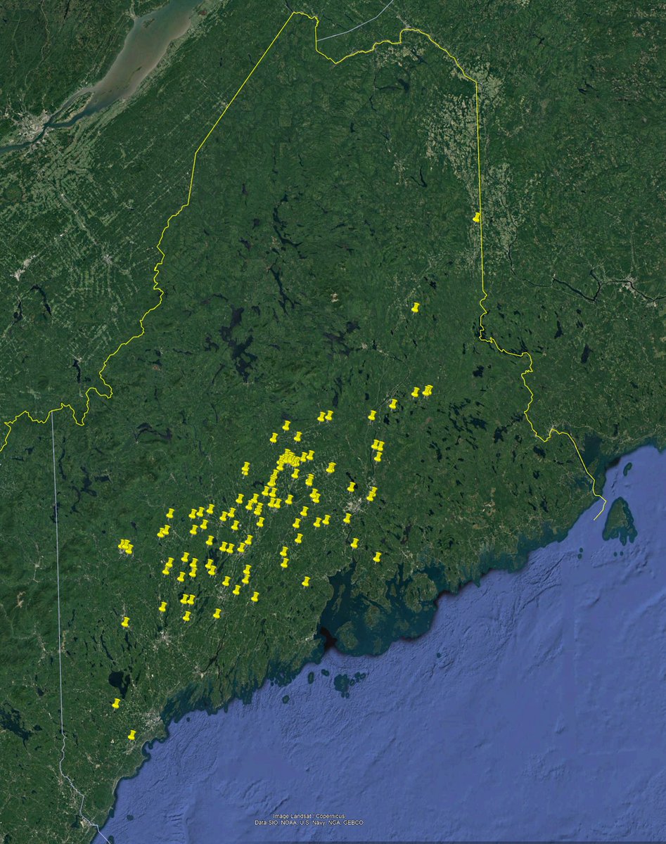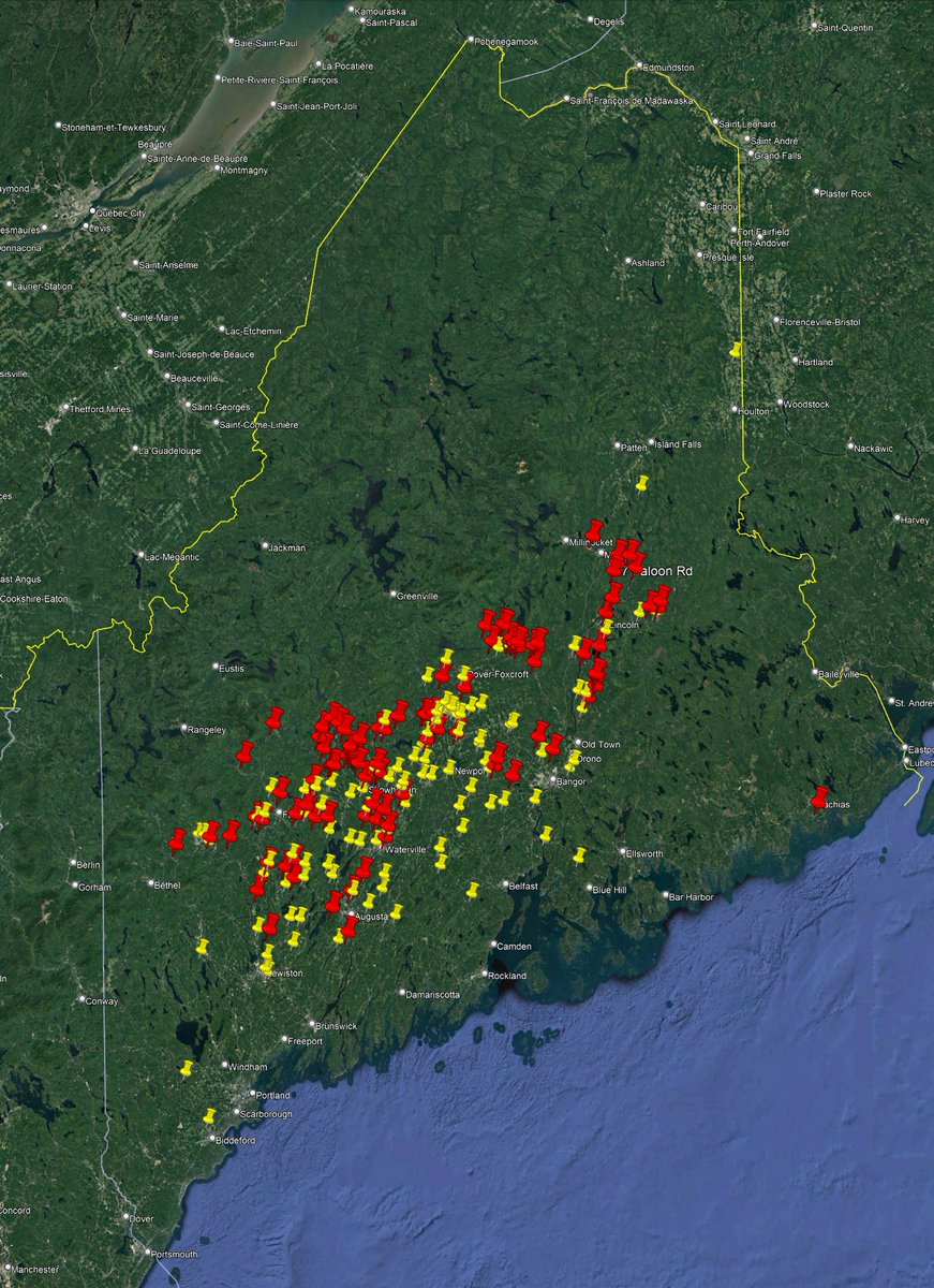 UPDATED ILLEGAL CHINESE MARIJUANA GROW MAP. Each red pin represents a new grow site identified by the Maine Wire since we posted the original map a month ago.