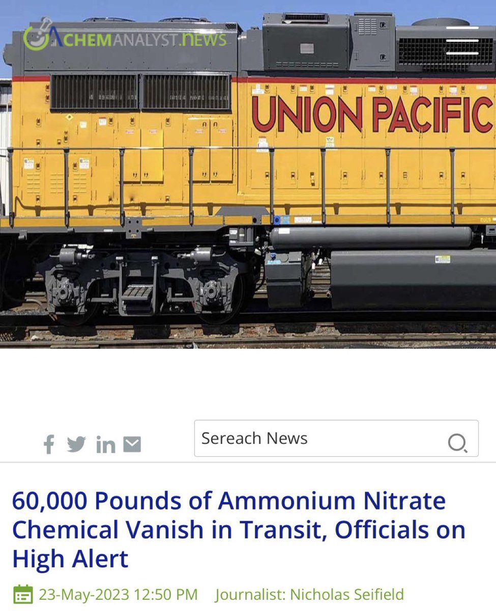 ⁉️now that Union Pacific has purchased Norfolk Southern to create "America’s first transcontinental railroad" - is it a bad time to bring up the still AT LARGE 60,000 pounds of AMMONIUM NITRATE that Union Pacific LOST in 2023 and is STILL MISSING to this day⁉️ https://www.chemanalyst.com/NewsAndDeals/NewsDetails/60000-pounds-of-ammonium-nitrate-chemical-vanish-in-transit-officials-on-high-alert-17383