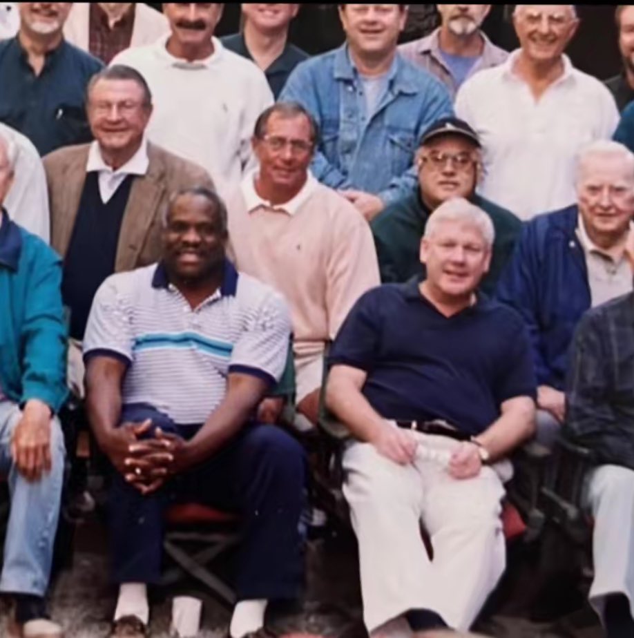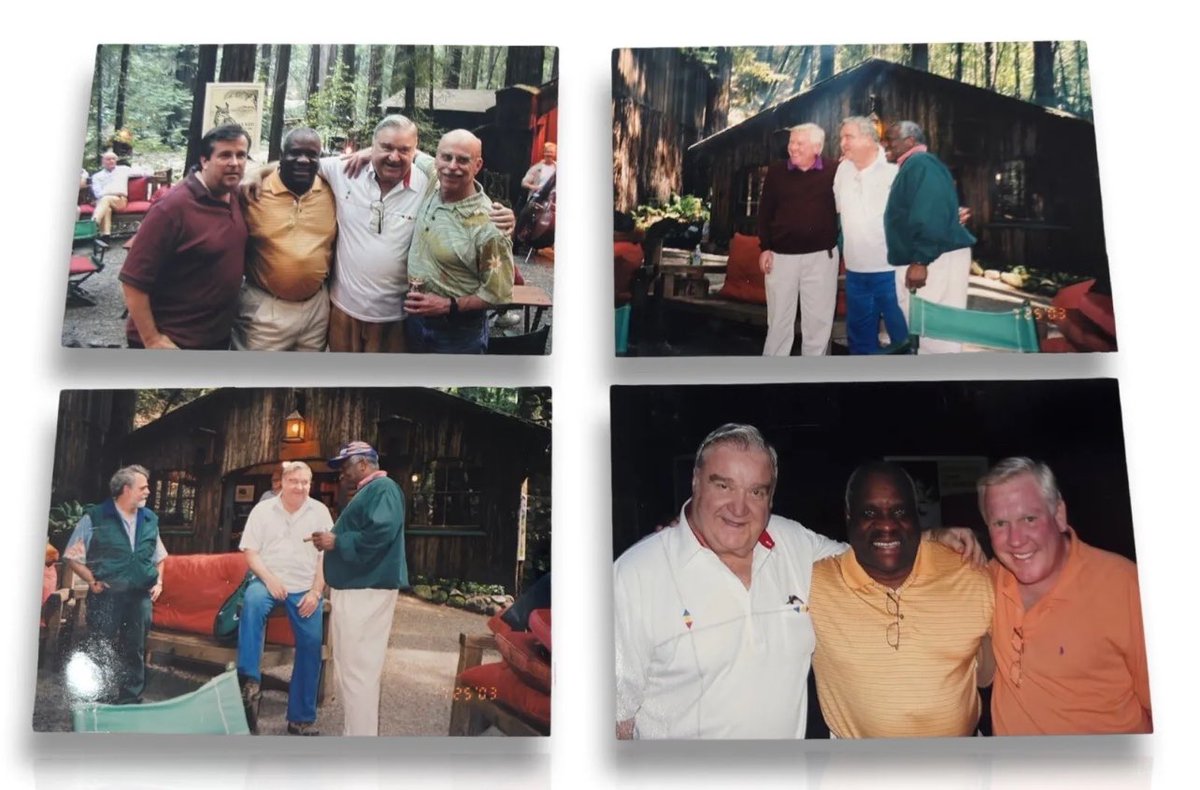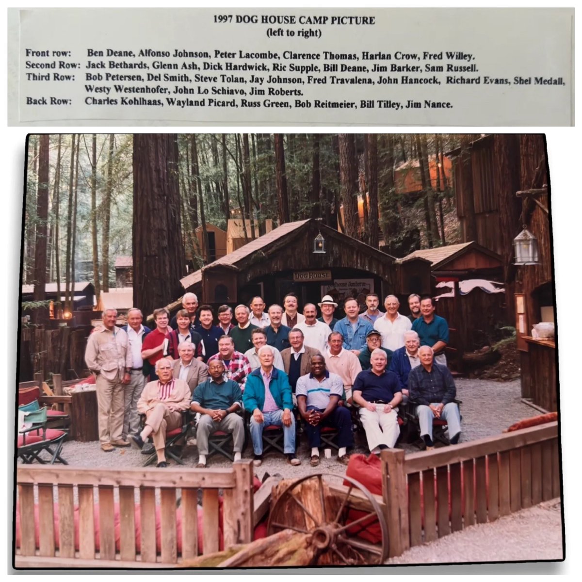 here are some photographs taken at Bohemian Grove in 1997. Supreme Court Justice Clarence Thomas and billionaire donor Harlan Crow can be seen, with others, posing for a group photograph in front of their cabin, called Dog House Camp. The Senate voted 52–48 on October 15, 1991, to confirm Thomas as an associate justice of the Supreme Court.