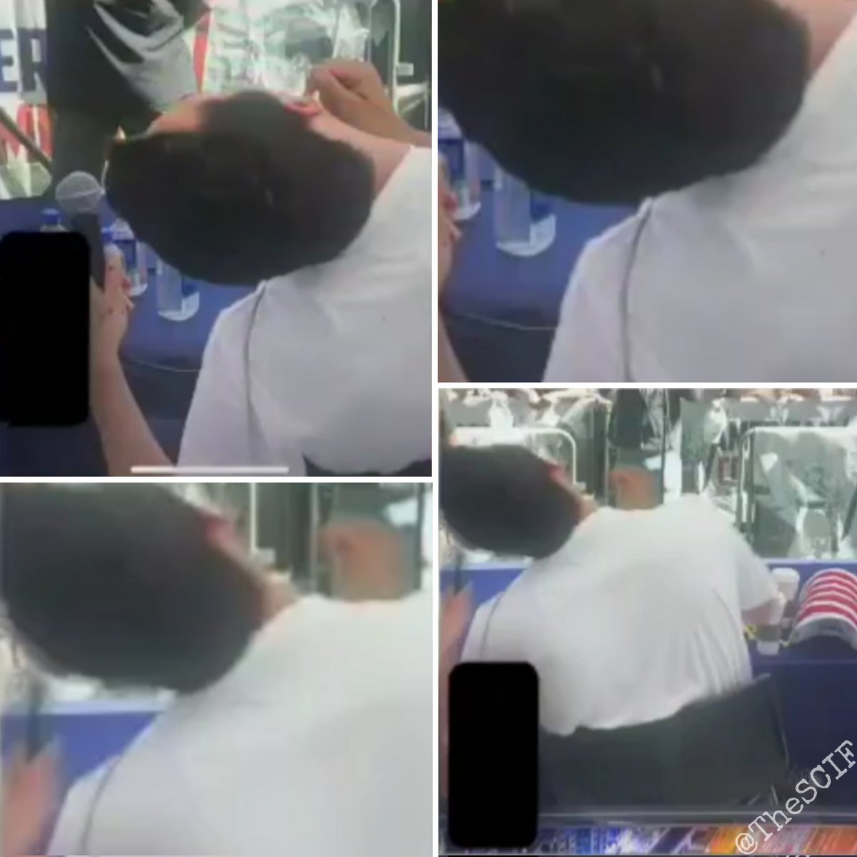 NEW images courtesy of Candace Owens shows no blood or exit wound from the camera behind Charlie Kirk on the day of his assassination. The "cord" is his necklace, and the only visible blood is in his hand by his microphone. This does not demonstrate the damage a .30-06 caliber round would cause 99% of the time, especially on such a thin, weak, part of the human body. More questions than answers.